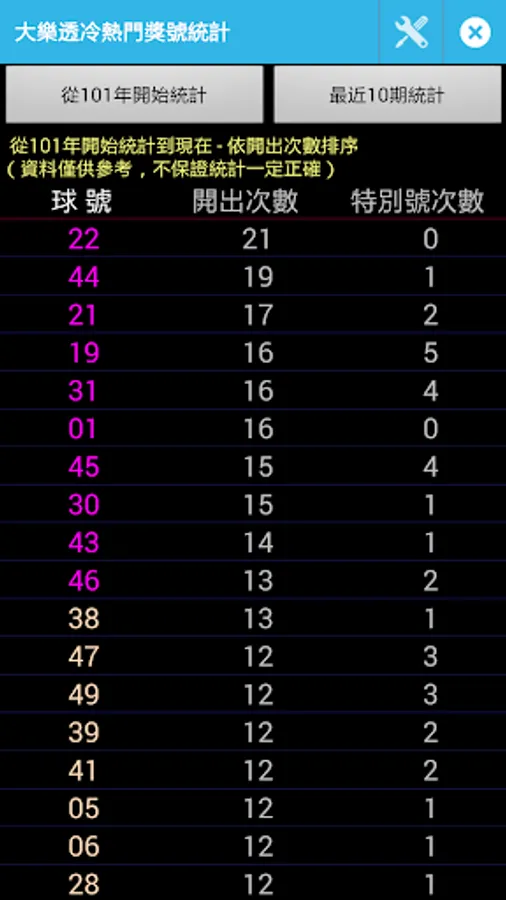 This program is not the official program of Taiwan Lottery Company and the Ministry of Finance. It has no relationship with Taiwan Lottery Company and the Ministry of Finance. If there is any error in the lottery information, the prize number and amount announced by Taiwan Lottery Company and the Ministry of Finance shall prevail.