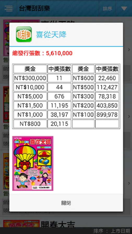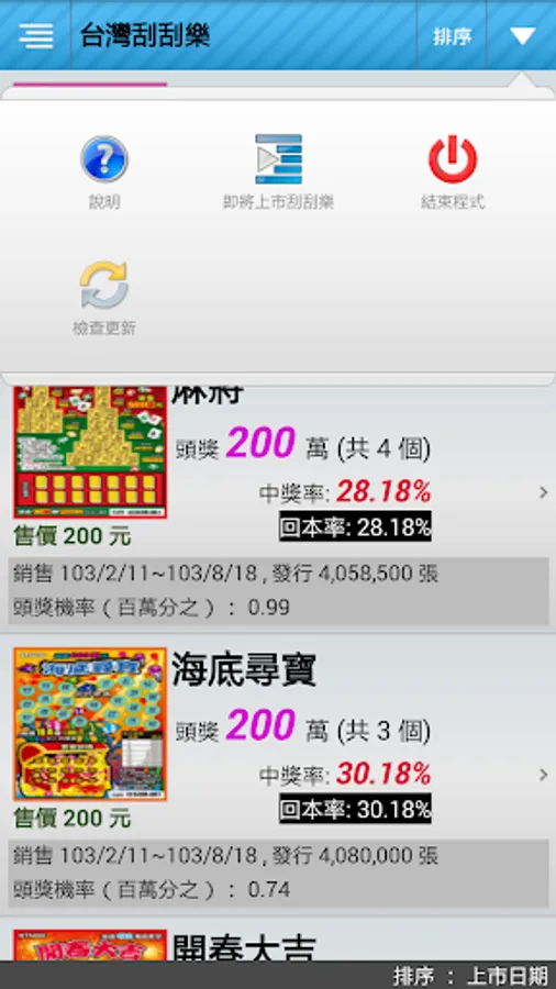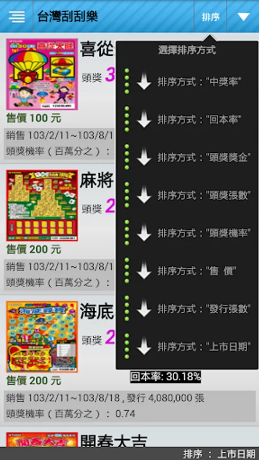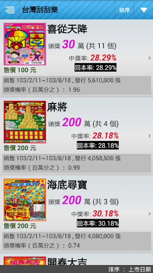 This small program that helps you to buy "scratch" lottery, which provides the name of the current market, "scratch" of the sale price, sale date range, first prize, first prize number of sheets, first prize probability, the winning rate , the rate of return, the number of sheets, and other information .... issue, and can be set to sort the "scratch" kind of level with the bottom eight kinds of conditions: