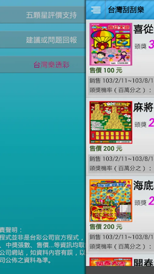 (2) The program sets the color is not the official program, with Taiwan Lottery Company does not have any relationship, "scratch" if wrong information to the data sets color company announced prevail.
