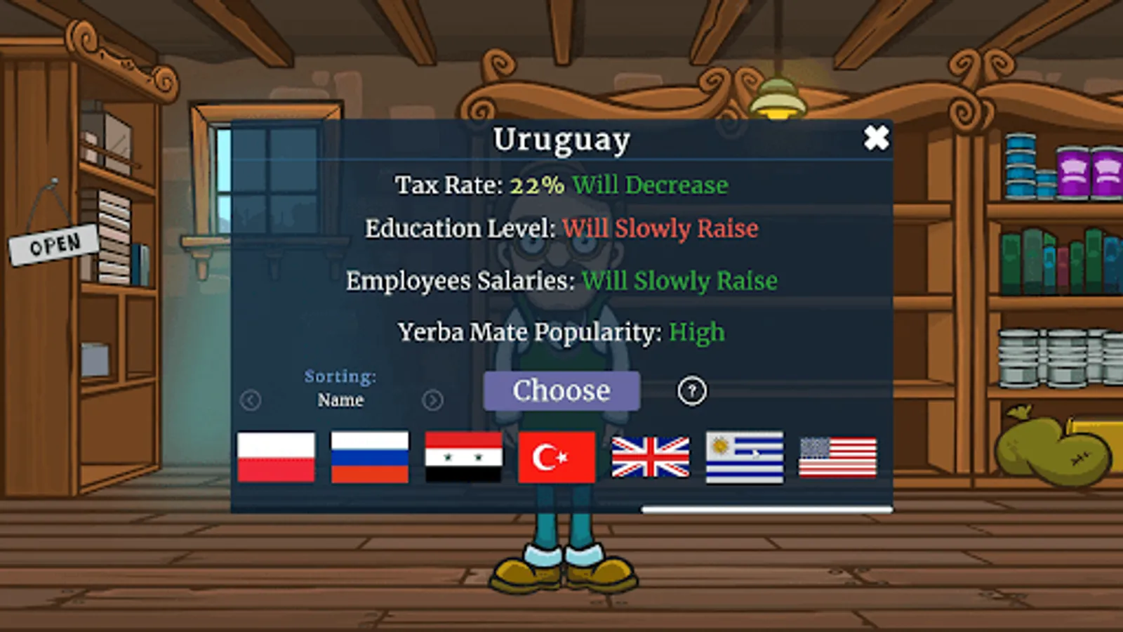 - Chose one country from 19 available in the game, set company and CEO stats. Countries got various tax rates, yerba popularity rate, workers salary, workers education, and change over time.