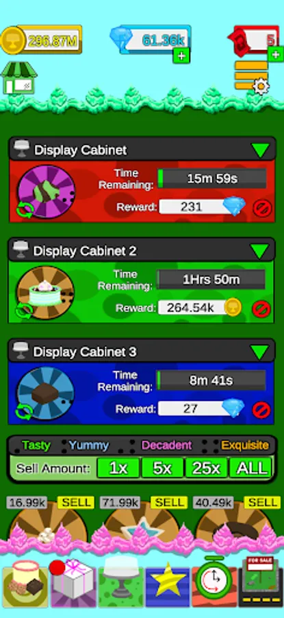Gain coins and sell your store to grow your tycoon empire. Gifts allow you to unlock special rare recipes which you can sell for higher profits. You can bake common, Tasty (uncommon), Yummy (rare), Decadent (epic) and Exquisite (legendary) desserts. Display your baked goods for sale in special display cases to increase your profits.