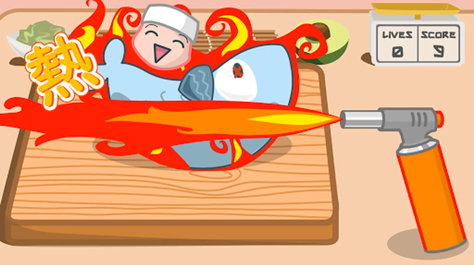 Jump and Roll with talent to avoid the knife and blowtorch preying on you, but be prepared: as you evade him the Sushi Master will get angrier, his attacks will grow more vicious and your life will hang by a scale!