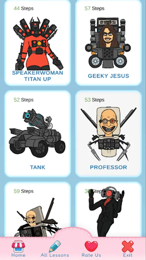 What to do in the application? To begin, select the character you want to draw. These can be CAMERAMAN, SPEAKER MAN, SPEAKERWOMAN, TV MAN, PROFESSOR, TITAN SPEAKERMAN. Having chosen a hero, start the lesson! Repeat all the steps given in the lesson, and you will easily draw the selected cartoon character skibidi toilet. Believe me, you don't need experience or drawing skills. Everything will work out! Follow the lessons of the application How to draw a skibibi toilet step by step and the result will not be long in coming!