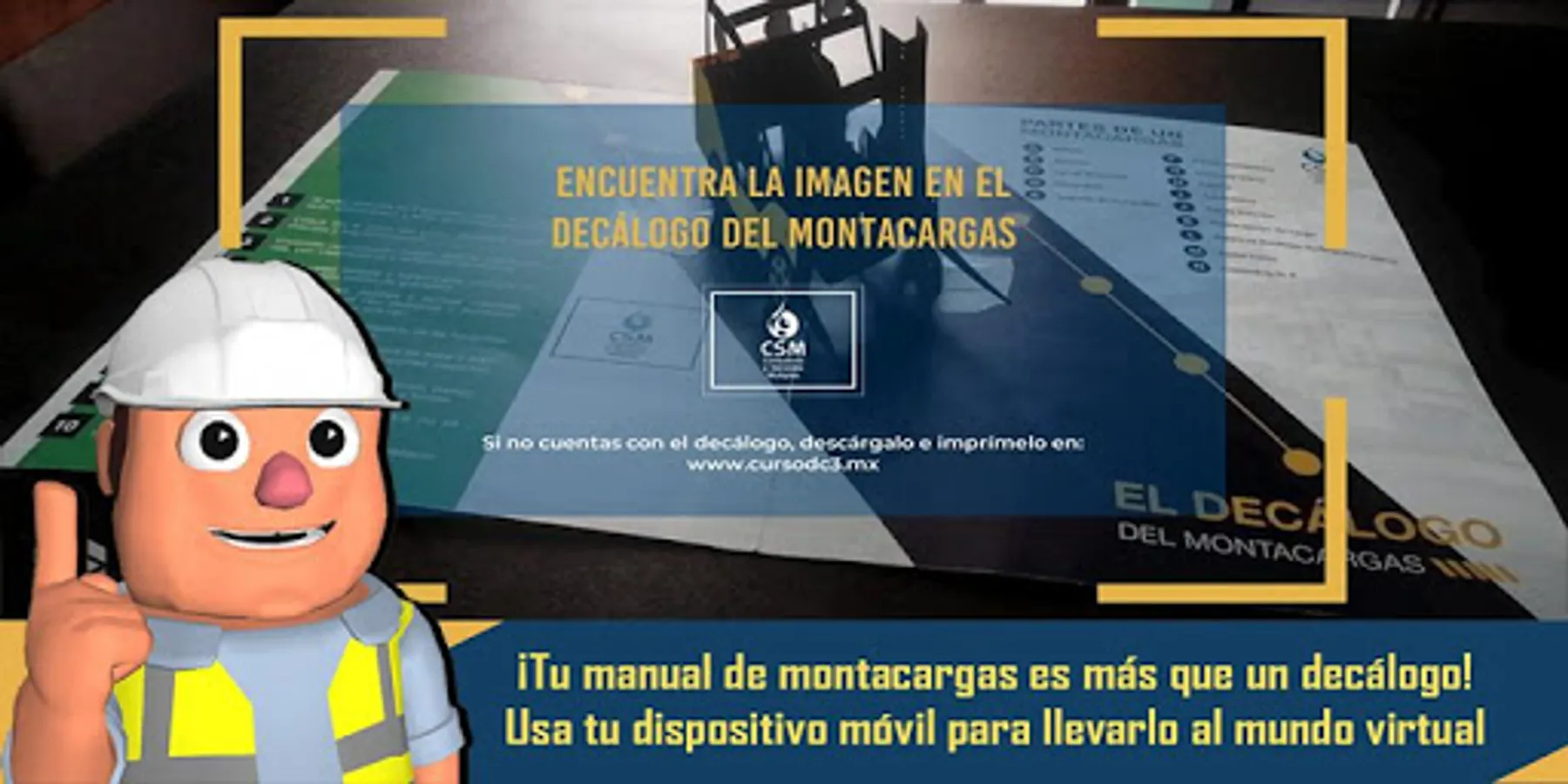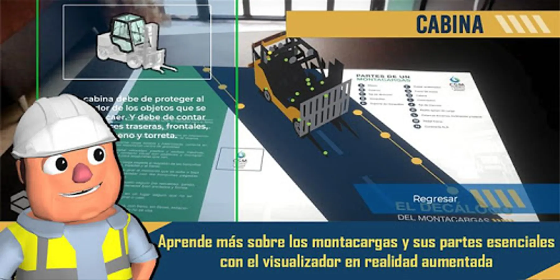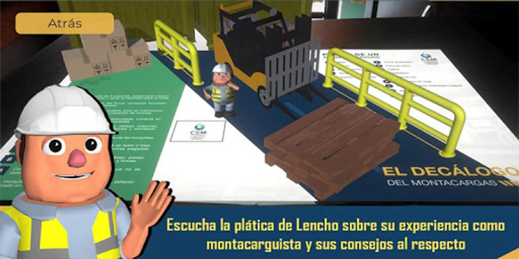 This app allows participants to explore through the Augmented Reality the parts of the forklift, deepen the points of the "Forklift Decalogue" by Carlos Guzmán, through a small talk by Lencho and a small game.