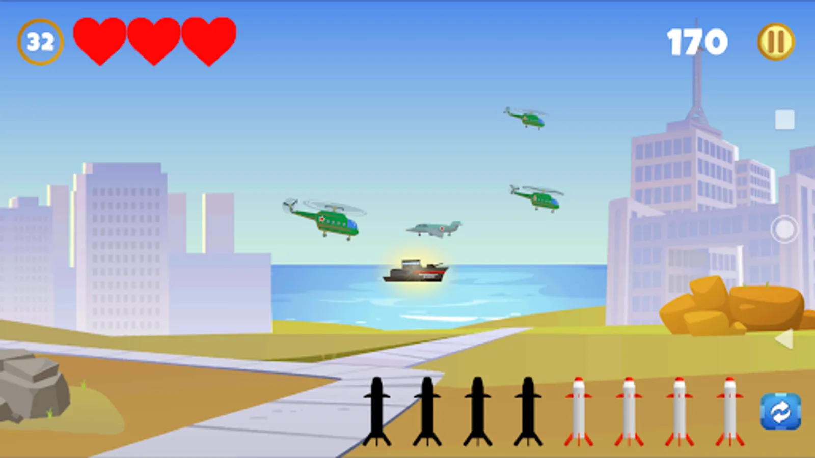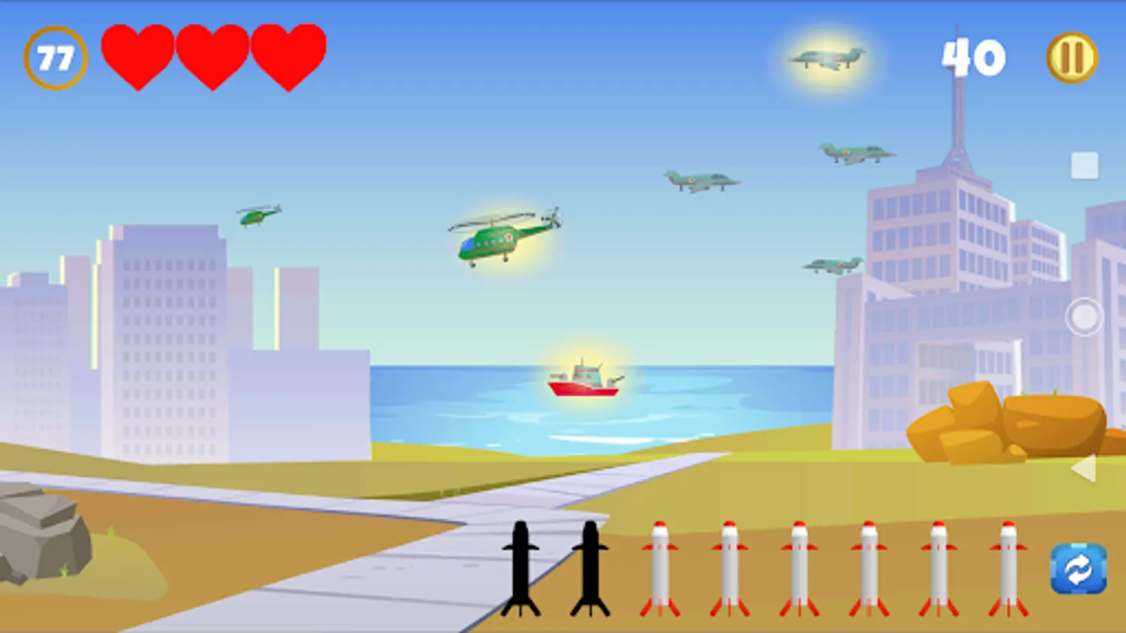 In this battle game, you have to protect the city from enemy aircraft and ships. Tap on the screen and destroy enemy planes and helicopters, and in the final sink a real warship to earn maximum points in this offline action game. Shoot them all!