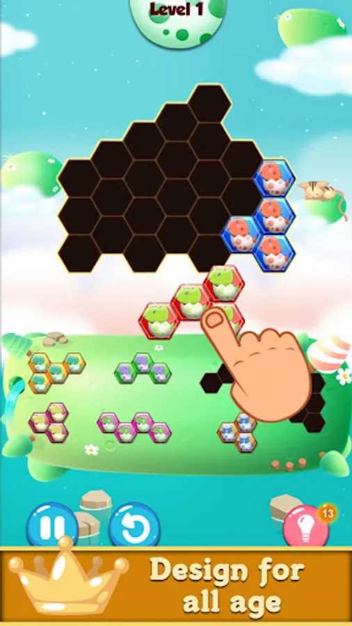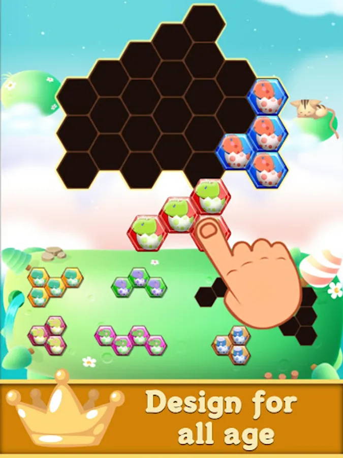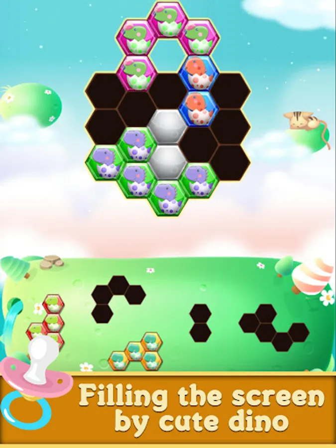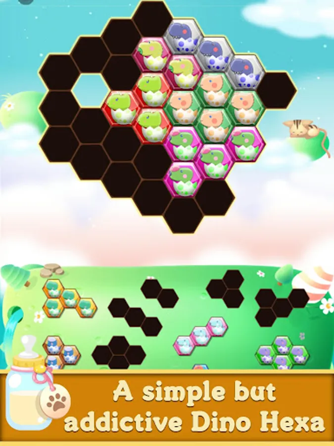 Fill in blank spaces with cute dinosaur hexagon puzzles. Enjoy fun and addiction.