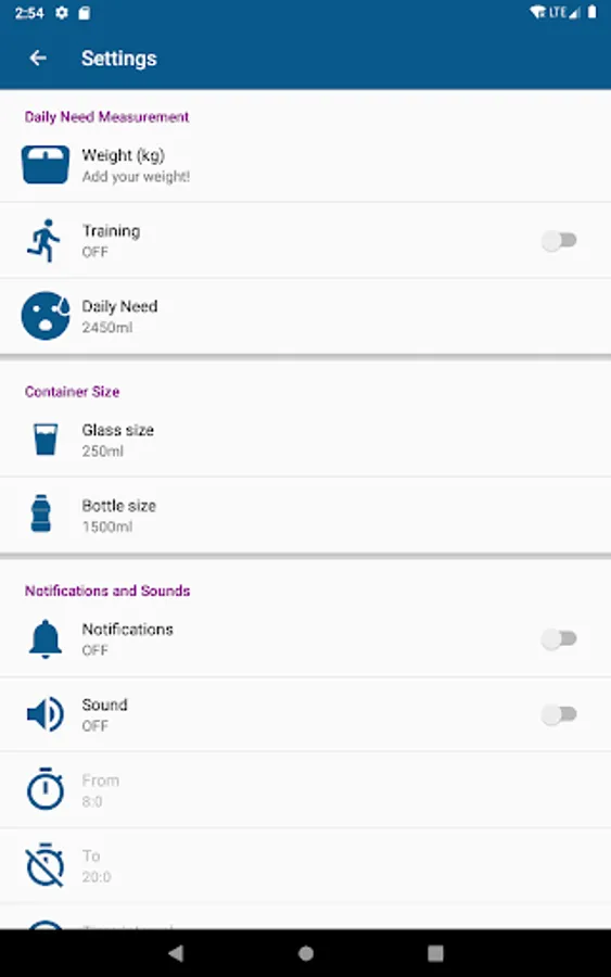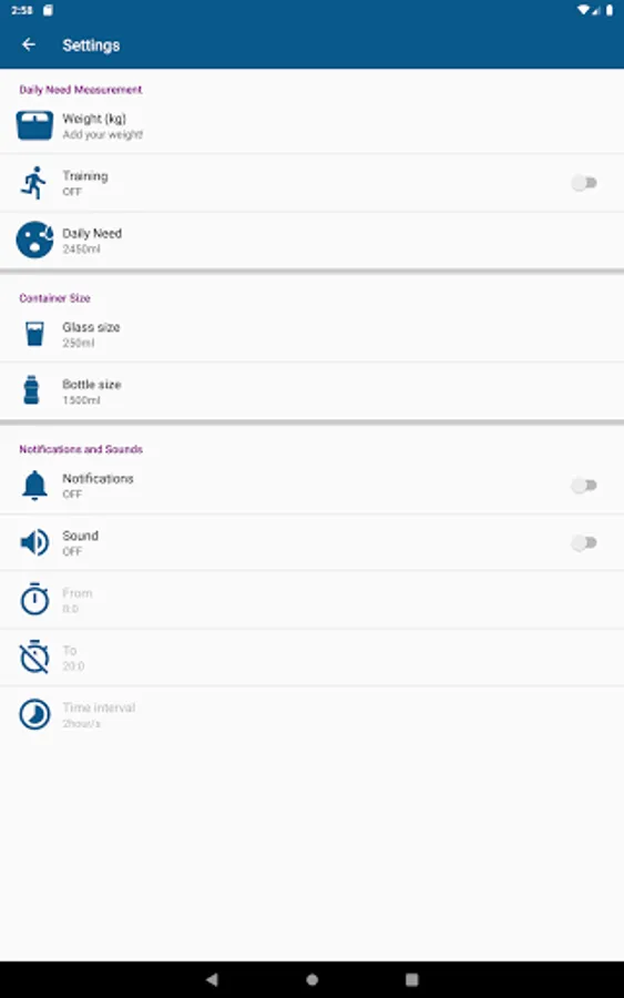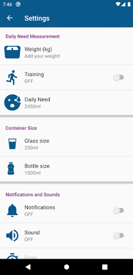 if you are doing any kind of exercise then app will calculate the daily need of water intake ,to maintain health and fitness