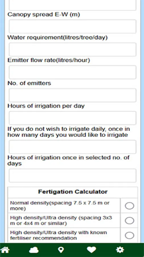 This calculator is to provide a general idea about the initial requirements. It is to mention that for yielding trees irrigation should commence only after flowering. After installing the system, the user has to make field adjustments after making several test runs.