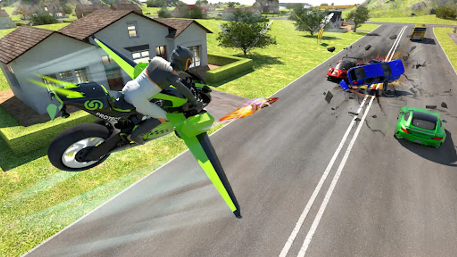 The flying motorbike is a marvelous turn in the bike driving game. It combines realism and fun riding physics to create an amazing motorcycle simulator on mobile with its advanced engine. Now you cannot only drive your bike but can fly in the highest skies leaving the busy streets of the city. One of the amazing motorbike flying simulators! Explore the beautiful world driving through streets or flying. In a sports bike simulator stunt mania racing game you can perform insane stunt actions to join the group of elite riders in the world championship of the motorbike simulator.