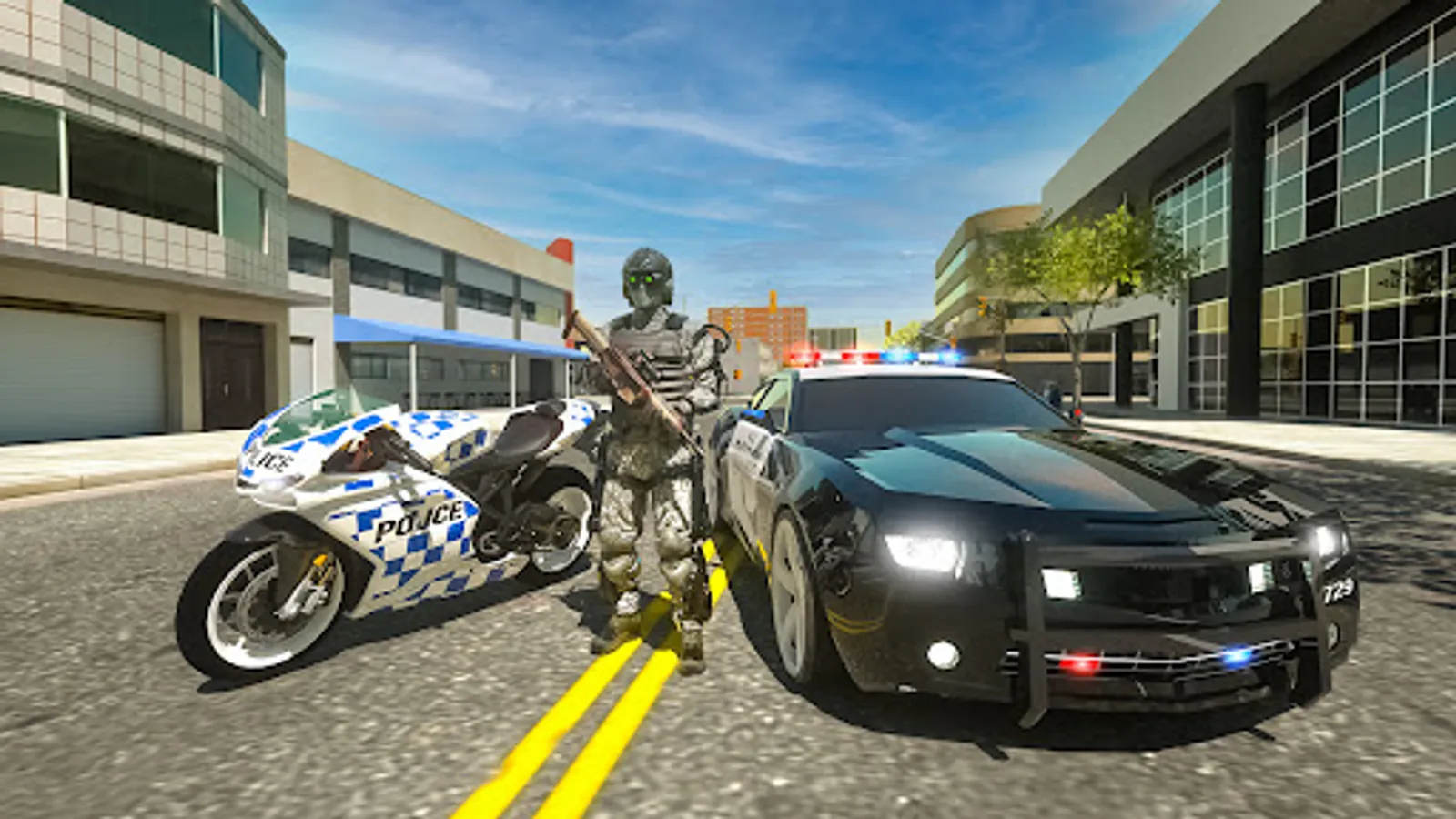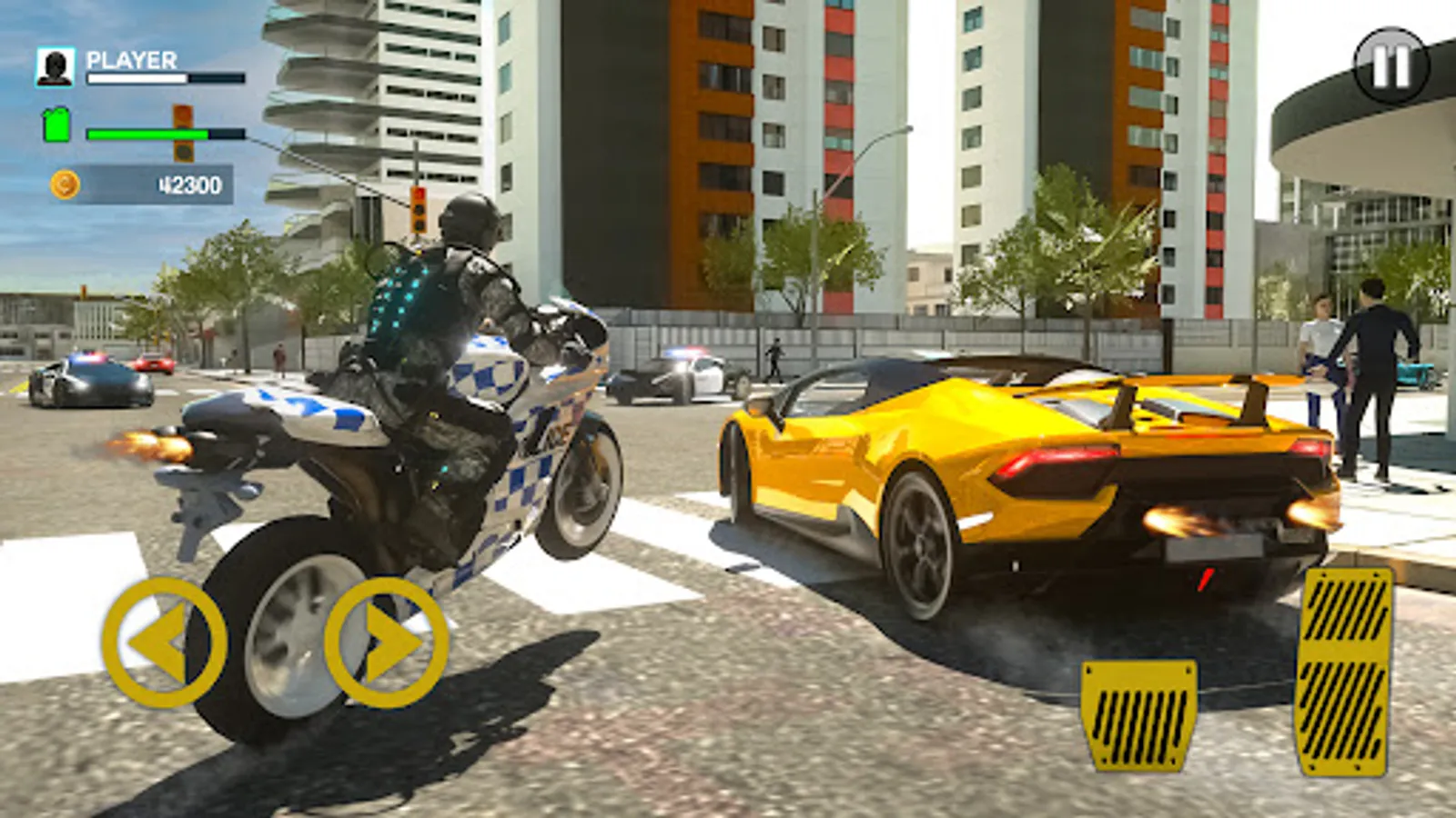 Ride your favorite police sports bikes, choose 4 different weapons, chase thieves, fight the evil and save your city from the darkness that is at the door. This is where you go all out and experience action, thrill and excitement.
