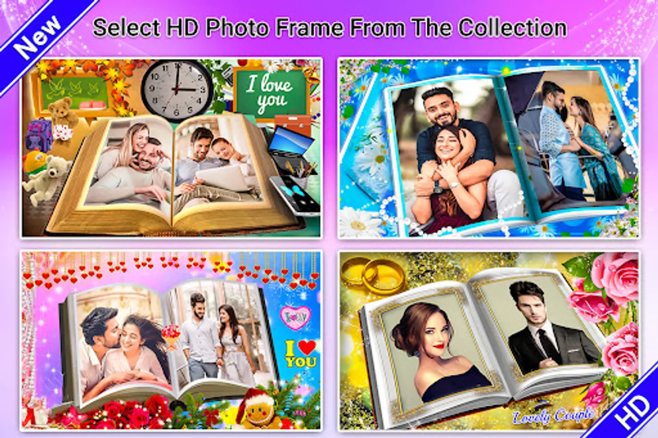 ✔ Crete your own photo book by mixup picture books in the dual photo frames. Set your photo in the open book pages, add your photo along with your partner photo to create the perfect dual partner book photo frame.