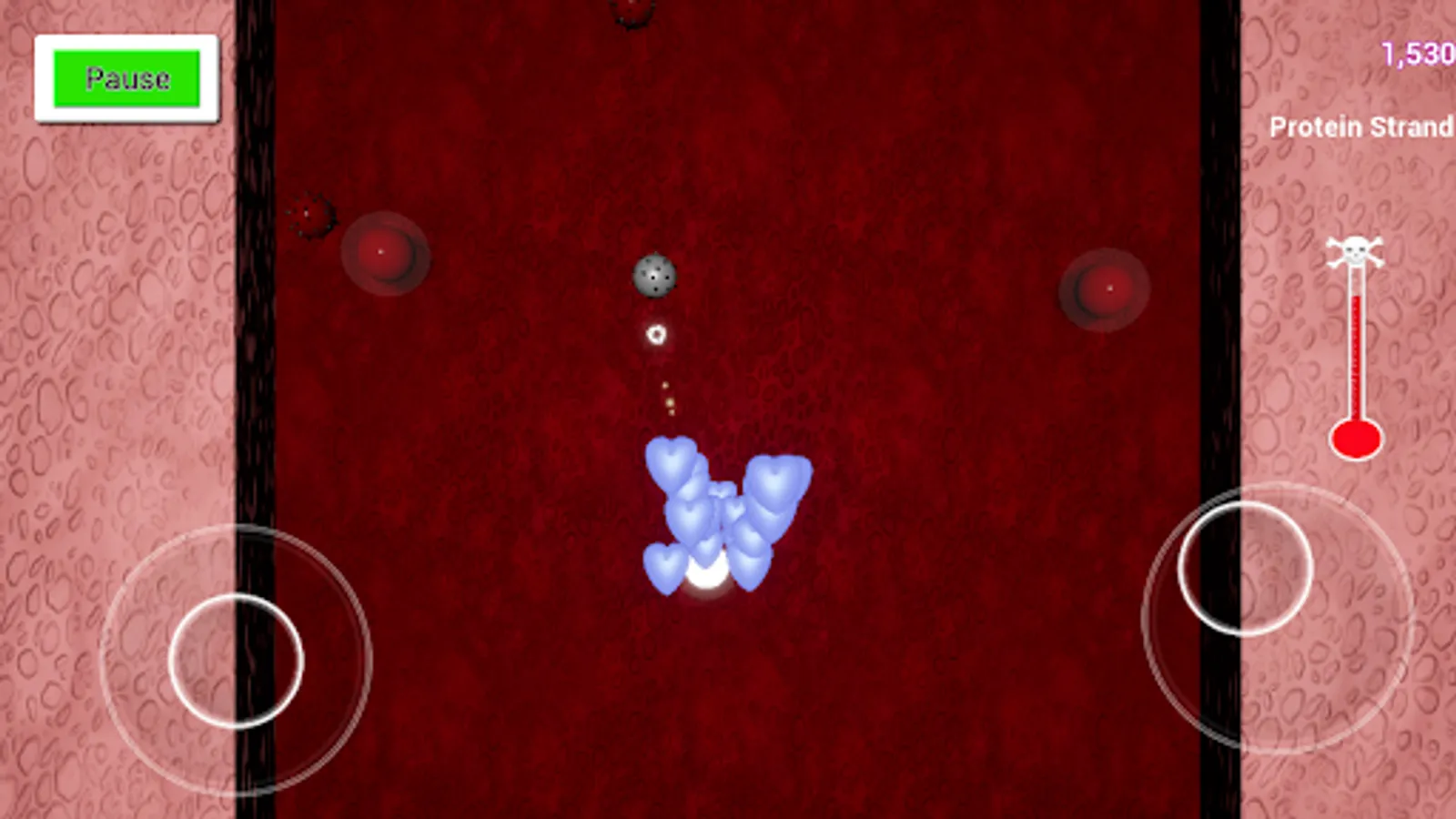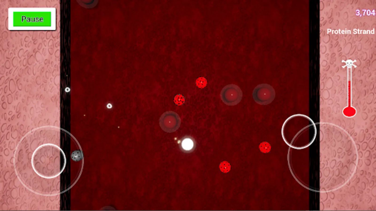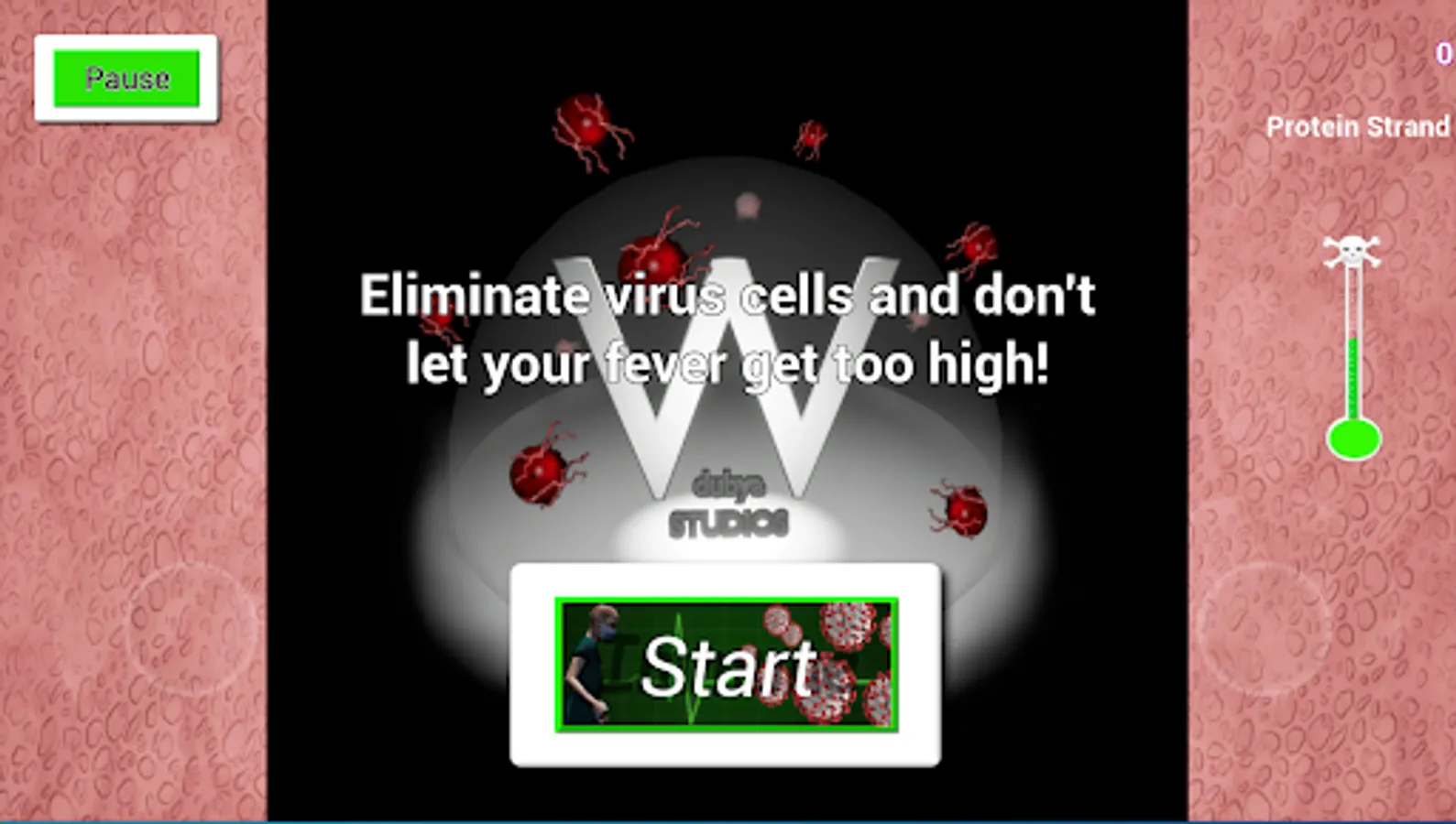 A virus has infiltrated your host. You have been tasked with eradicating the virus. Fire protein strands at virus cells rendering them inert and at infected cells to destroy them before they release more of the invaders and infect healthy cells. If you let too many escape your fever will rise to a critical level and eventually take your host! Destroy enough of the virus and lower your temperature to defeat the invader. Twin stick shooter