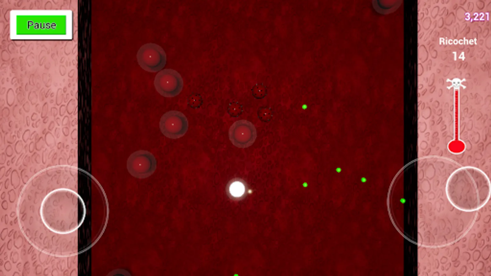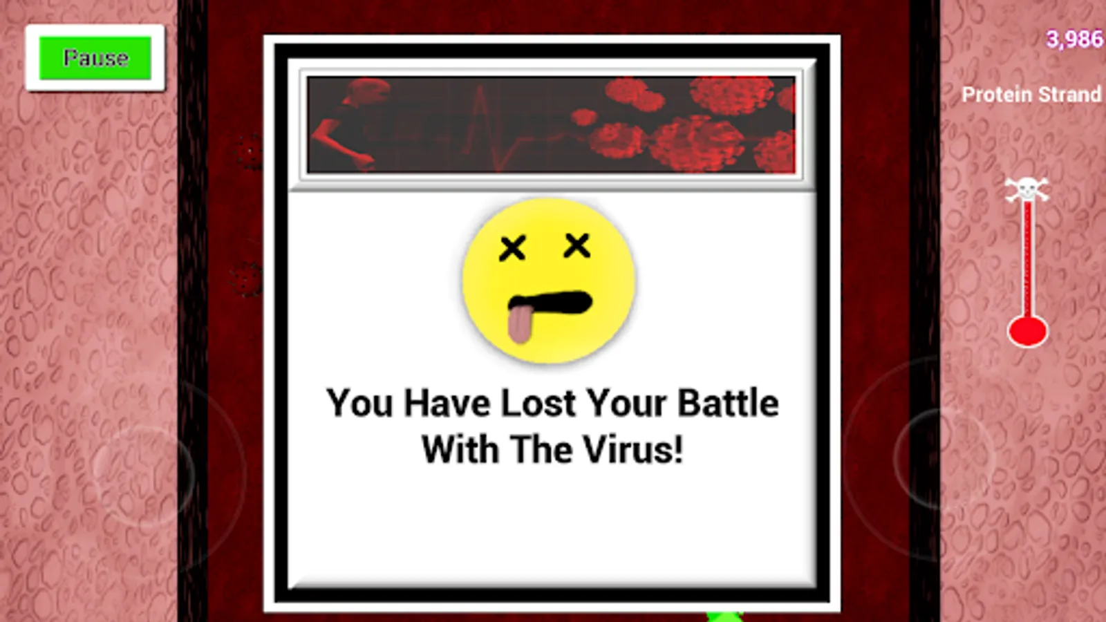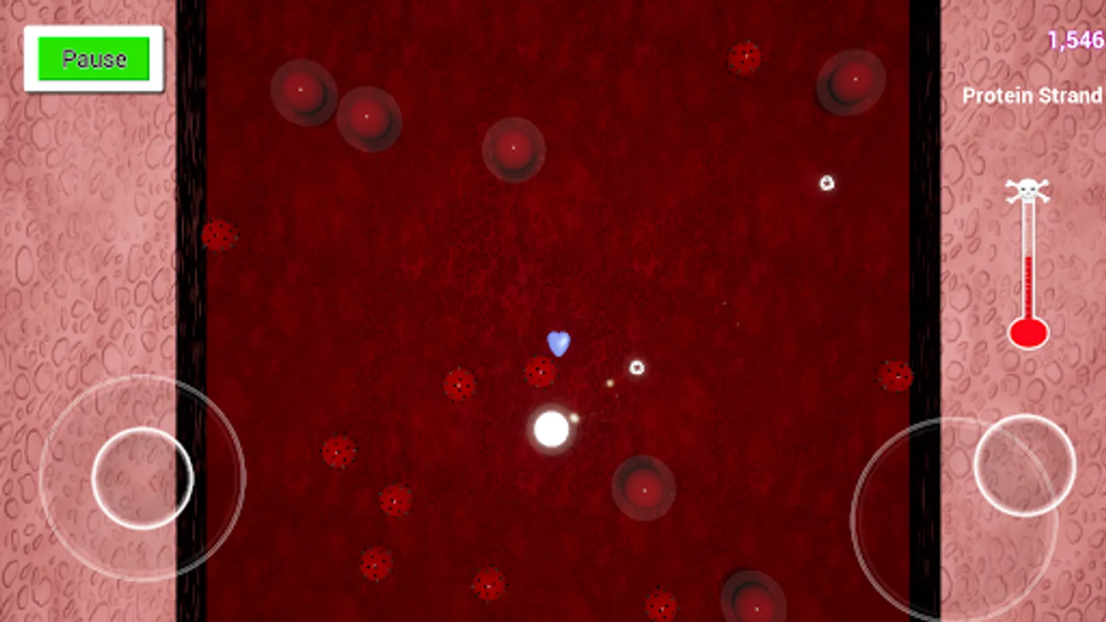 A virus has infiltrated your host. You have been tasked with eradicating the virus. Fire protein strands at virus cells rendering them inert and at infected cells to destroy them before they release more of the invaders and infect healthy cells. If you let too many escape your fever will rise to a critical level and eventually take your host! Destroy enough of the virus and lower your temperature to defeat the invader. Twin stick shooter