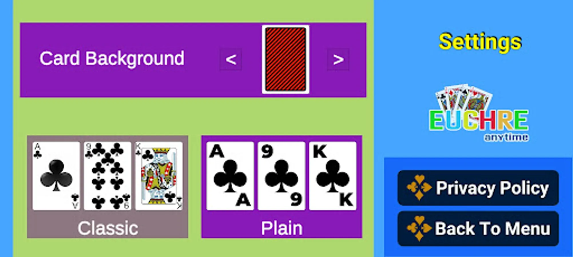 Euchre is played with 24 cards Aces, Nines, Tens, Jacks, Queens and Kings from each suit are used in this game.