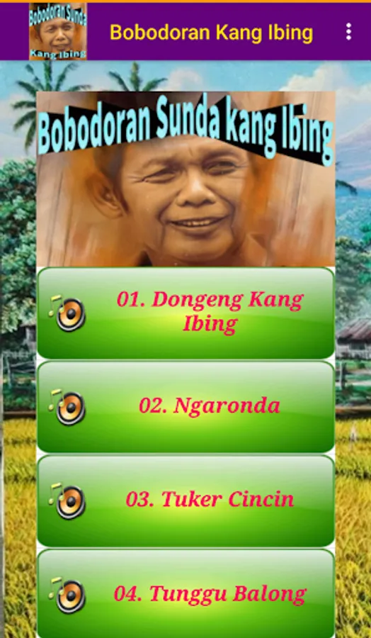 Enjoy the best complete collection of Sundanese Bobodoran (Sundanese Funny Stories) from the legendary Sundanese cultural historian, Kang Ibing. Install and enjoy the funny Sundanese stories presented by Kang Ibing et al. Enjoy funny stories typical of Sundanese bobodoran such as Fairy Tales of Kang Ibing, Ngaronda, Tuker Cincin, and Wait Balong. You can listen to all bobodoran even without an internet connection.