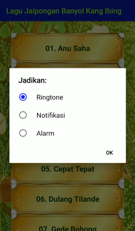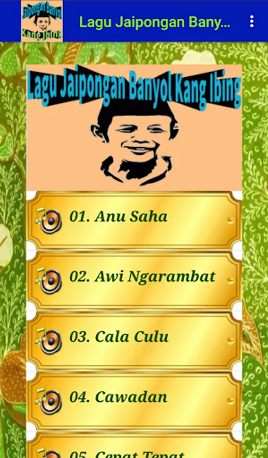 An application that contains a complete collection of Spanish jaipongan songs from the legendary Sundanese cultural observer, Kang Ibing. Install and enjoy a different experience from jaipongan songs combined with typical Sundanese jokes from Kang Ibing. Enjoy various jaipongan jaipongan songs such as Cepat Sempurna, Kawin Dilangit, Tarung, Kadipaten, Wife of Tumarima, etc. All songs can still be listened to even without an internet connection. Also can be used as Ringtone, Notification, and alarm.