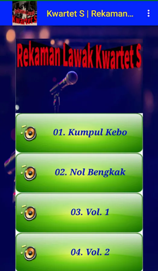 An Android application is presented that contains old-school comedy recordings from legendary Indonesian comedy groups and comedians. This time, we present a complete collection of legendary group comedy recordings which are very famous for their cuteness throughout Indonesia, the quartet S.Install comedy group and enjoy Javanese (Malang) jokes from Quartet S such as Kumpul Kebo, Nol Bengkak, Vol. 1, Vol. 2, and Vol. 3.