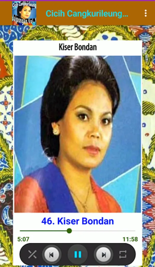 Enjoy the first part of the complete collection of classic Sundanese Jaipongan Songs sung by sinden Cicih Cangkurileung. Contains popular jaipongan songs from pasundan lands such as Kembang Ros Beureum, Haur Koneng, Daun Puspa, Caringin Nu Jadi Witness, Bangbung Hideung, Imut Keursaha, etc. Install and enjoy the beautiful voice of Cicih Cangkurileung, developing original jaipongan songs.