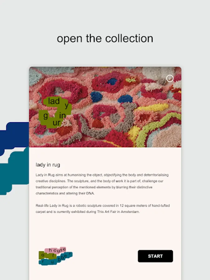 Real-life Lady in Rug is a robotic sculpture covered in 12 square meters of hand-tufted carpet and currently exhibited during This Art Fair in Amsterdam (7-11.06.22).