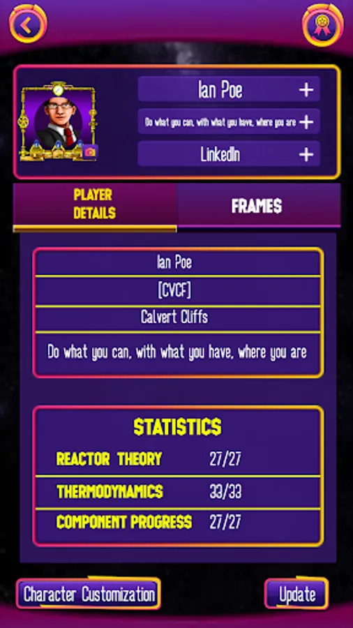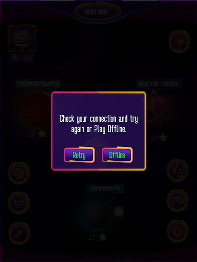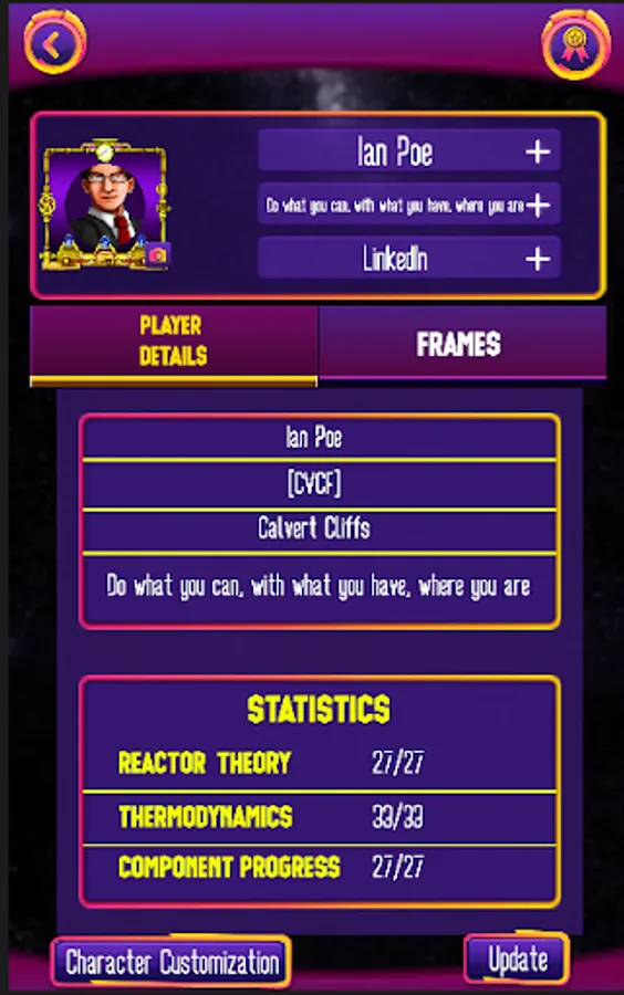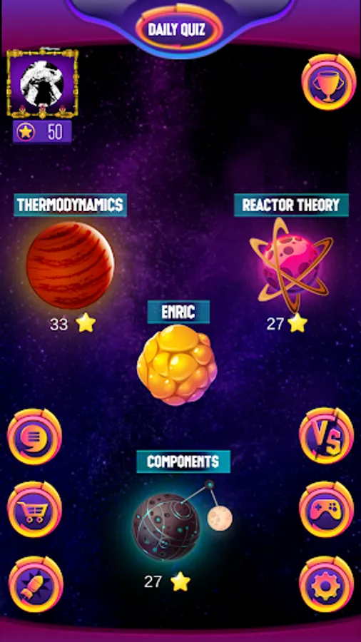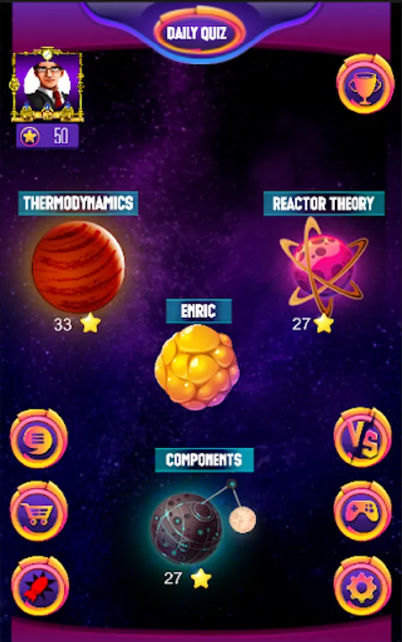 Join Ian Poe and Juan Ortega on your quest through each world's 10-question quiz-based missions. Challenge each world's respective General in a 30-question quiz for planetary mastery. General Pandid of Components World, General Keff of Reactor Theory World, and General Bernoulli of Thermodynamics World stand between you and your claim to Enric. With each world successfully conquered, a 50-question quiz with Enric on his asteroid stands between you and your claim to GFES mastery.