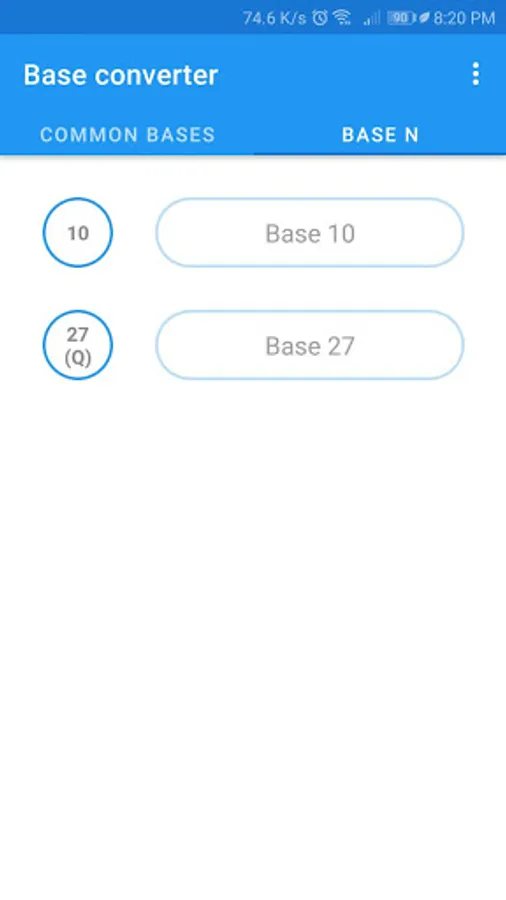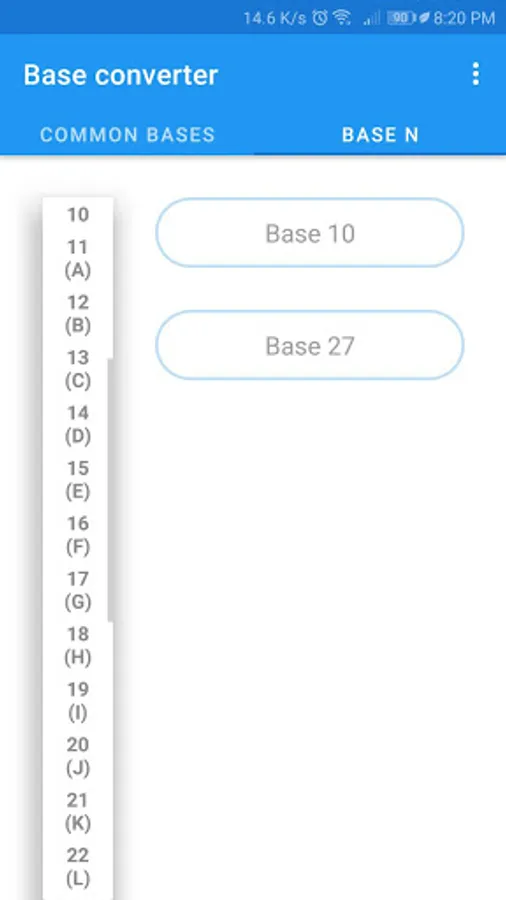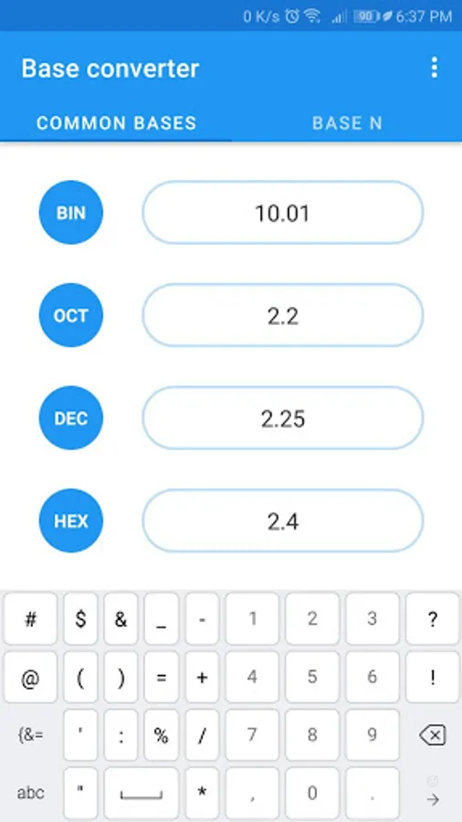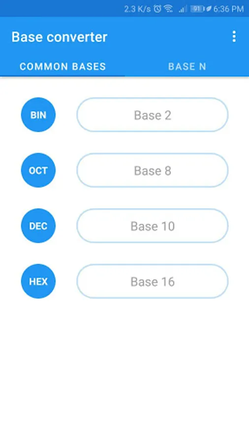 Base Converter is an App that converts numbers between different numerical bases (2 to 36), with a section for the most used ones: binary (BIN - base 2), octal (OCT - base 8), decimal (DEC - base 10) , hexadecimal (HEX - base 16) and another to make conversions between any two bases.