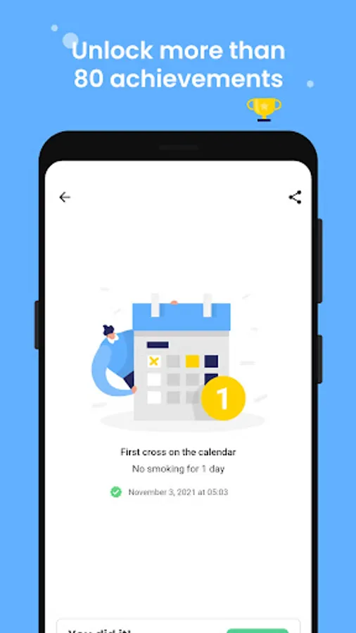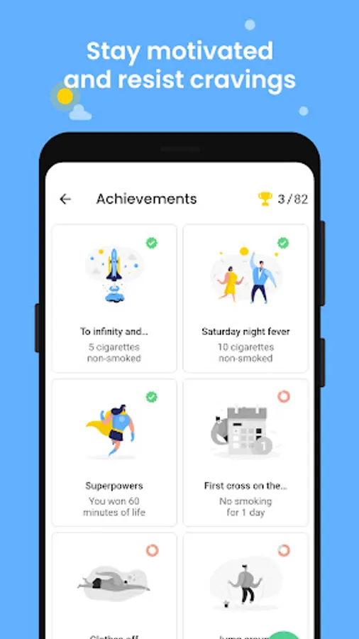 🏆 Achievements: your quit smoking motivations: As with all tasks in life, quitting smoking is easier when you divide the task into small and easy ones. So, QuitNow offers you 70 goals based on the cigarettes you avoided, the days since your last cigarette, and the money saved. So, you will start celebrating achievements from the first day.