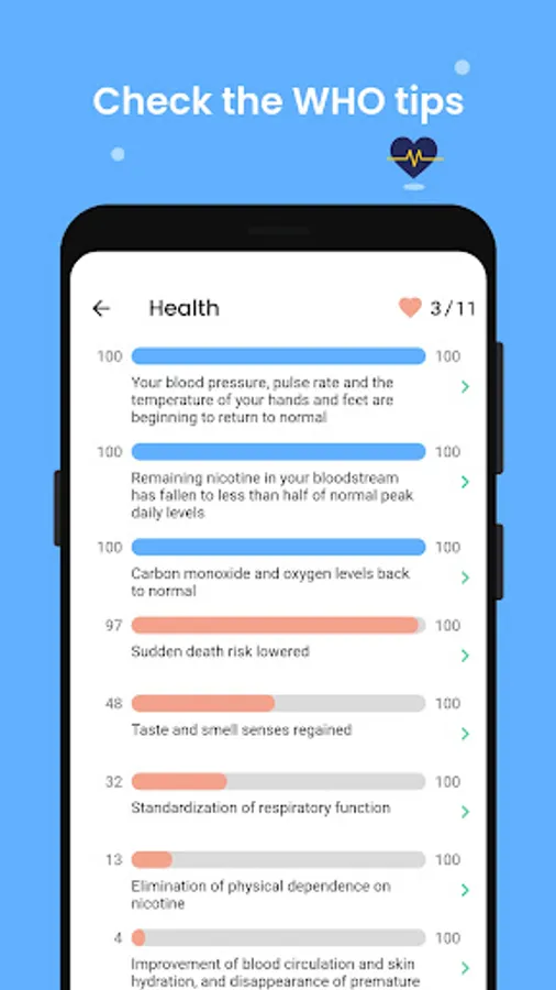 ❤️ Your ex-smoker health: QuitNow offers a list of health indicators to explain how your body improves day by day. They are based in the World Health Organization ones, and we update them as soon as the W.H.O. does.