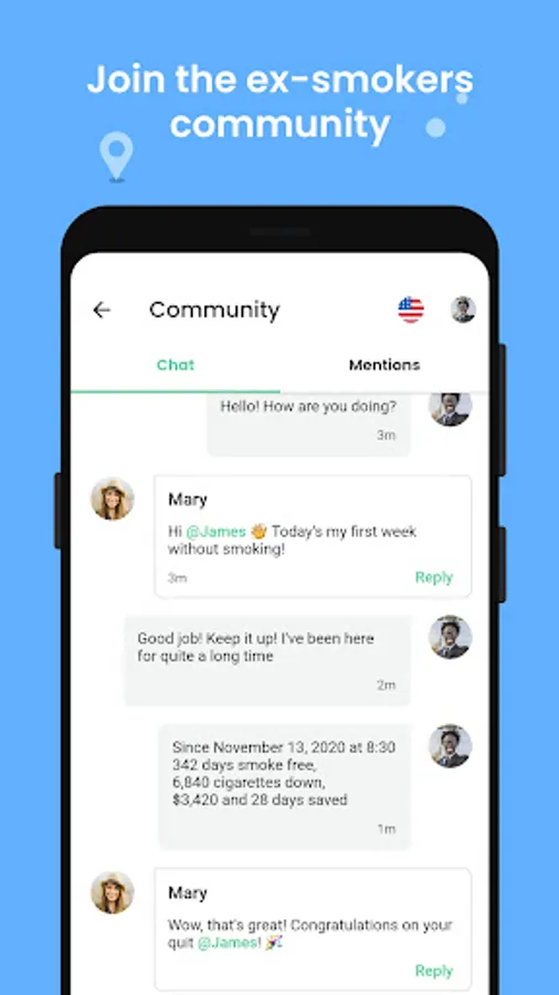 💬 Community: the ex-smokers chat: When you quit smoking, you need to stay within the non-smoking areas. QuitNow offers a chat full of people that, like you, said goodbye to tobacco. Spending time with nonsmokers will make your way easier.