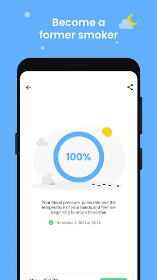🗓️ Your ex-smoker status: When you quit smoking, the focus has to be on you. Remember the day you quitted and get the maths: how many days are you free of smoke, how much money you saved, and how many cigarettes you avoided.