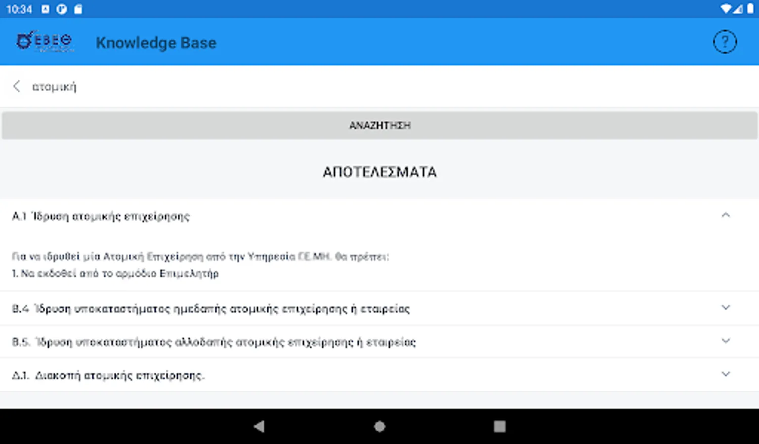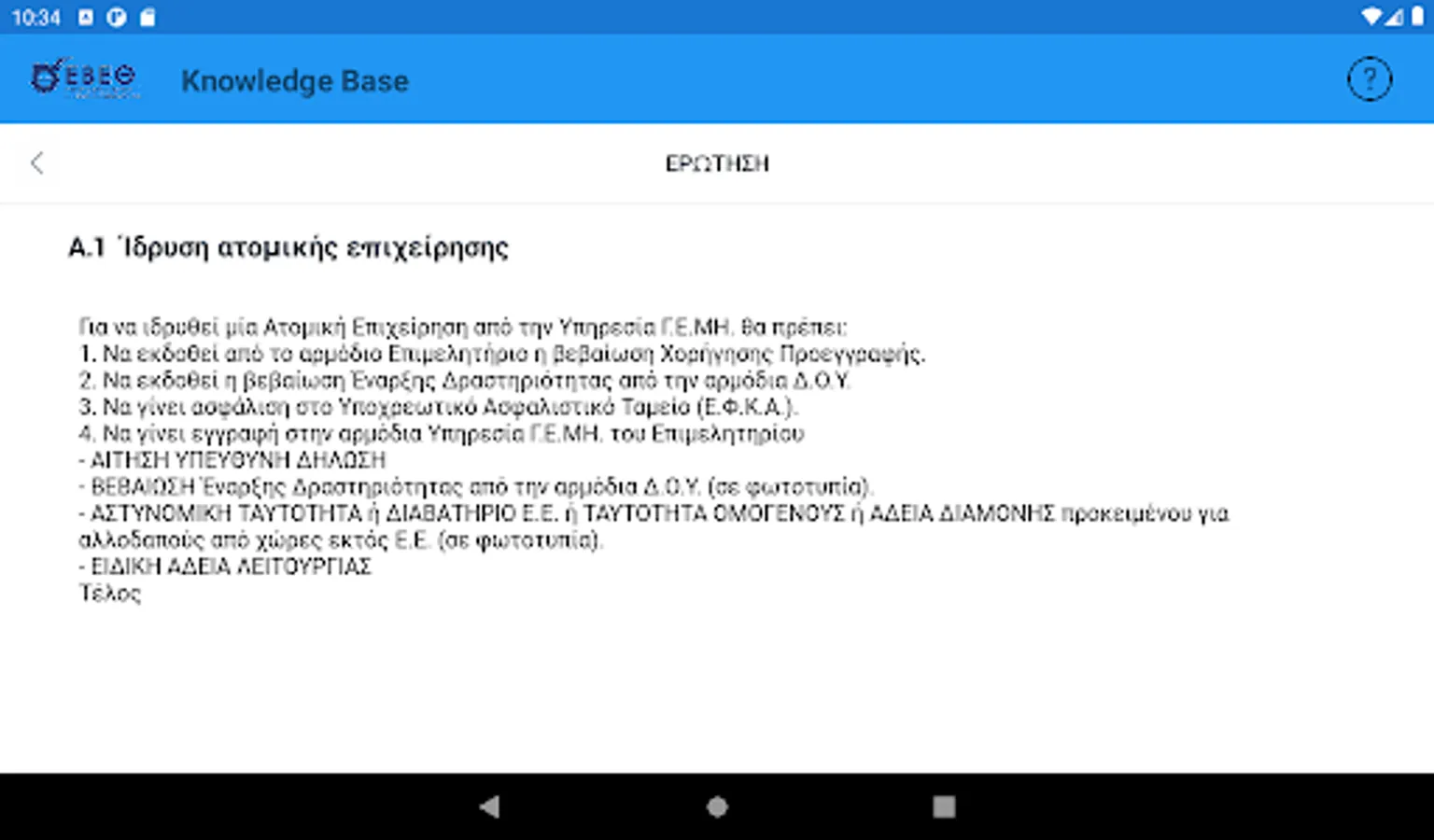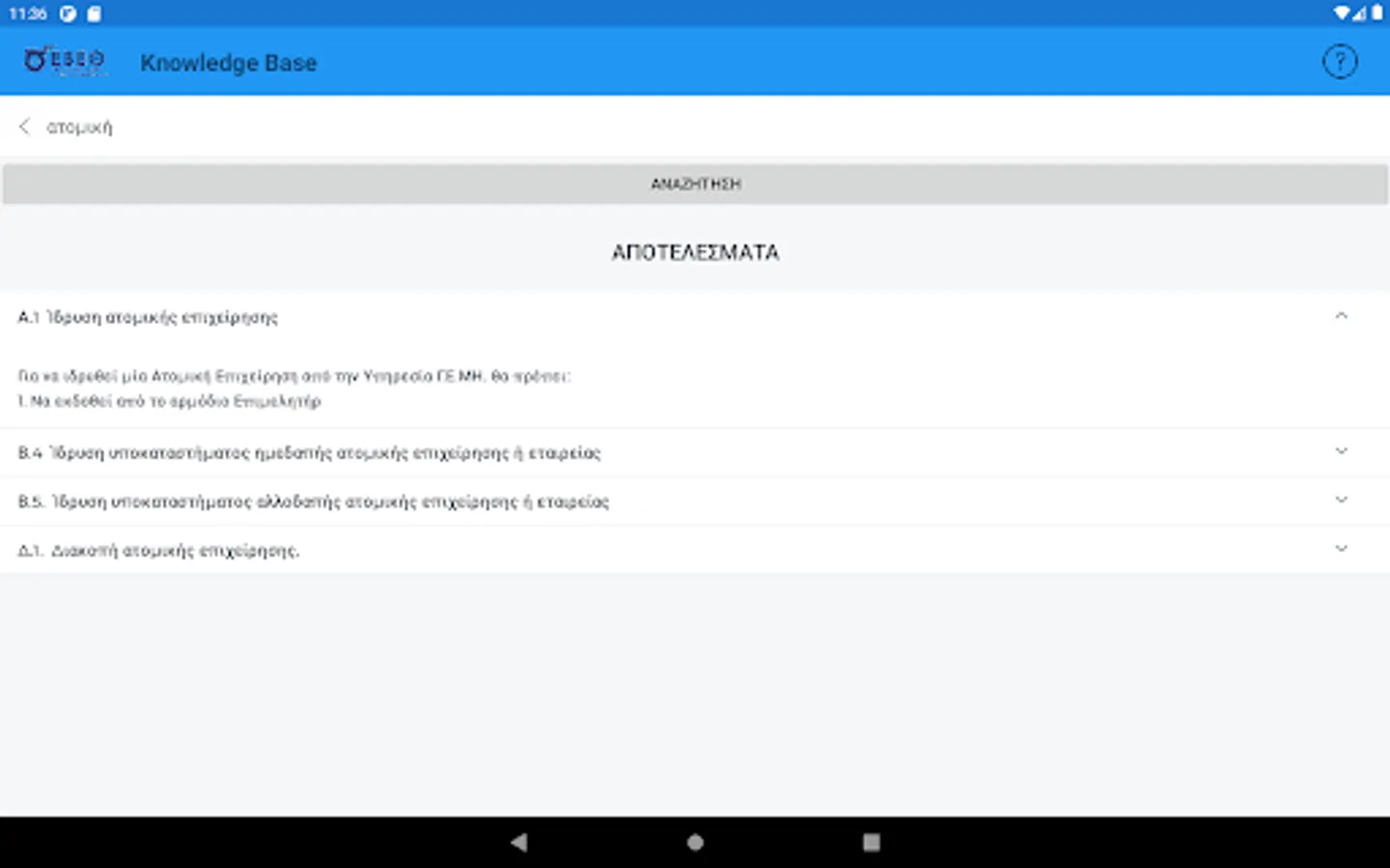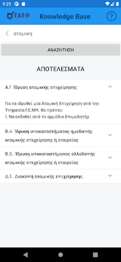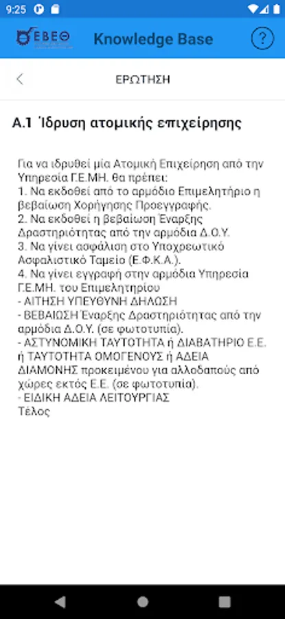 The interested entrepreneur, in the form of questions using keywords, can search and be informed immediately about the various administrative procedures related to the start (eg licensing, etc.), the central public administration, the district, the local authorities, the insurance organizations etc. or the operation of its existing business (eg new activity requiring an operating license, relocation of headquarters to industrial parks, etc.).