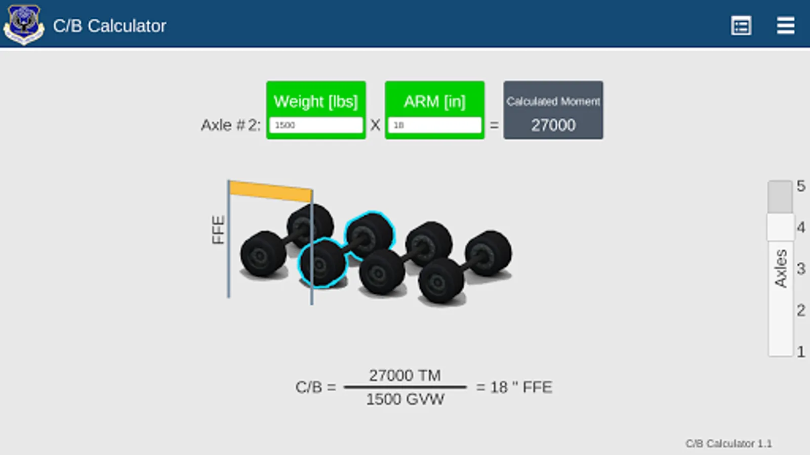 Center of Balance (CB) Calculator –This app provides users a tool to expeditiously calculate the center of balance for equipment with up to 5 axles and a Pallet Train with up to 10 boxes. The user begins by selecting the number of axles they want to figure out the center of balance for, and a representation of those axles are shown on the screen. The user then annotates the distance from front end (FFE) for each axle and the axle’s weight and the text box where the user inputs data will change from red to green when the data is correct. The user repeats the process for each axle and if all information is entered correctly, the app displays the center of balance for the user. If the data is incorrect, the center of balance will not display. Additionally, the app provides the user with a “Form view” where the numerical calculations are displayed. This is a great benefit that helps members ensure they are annotating the data correctly. After the user is complete with the vehicle or pallet train, they can either start a new vehicle, or quit the application.