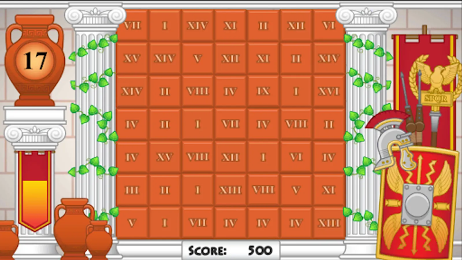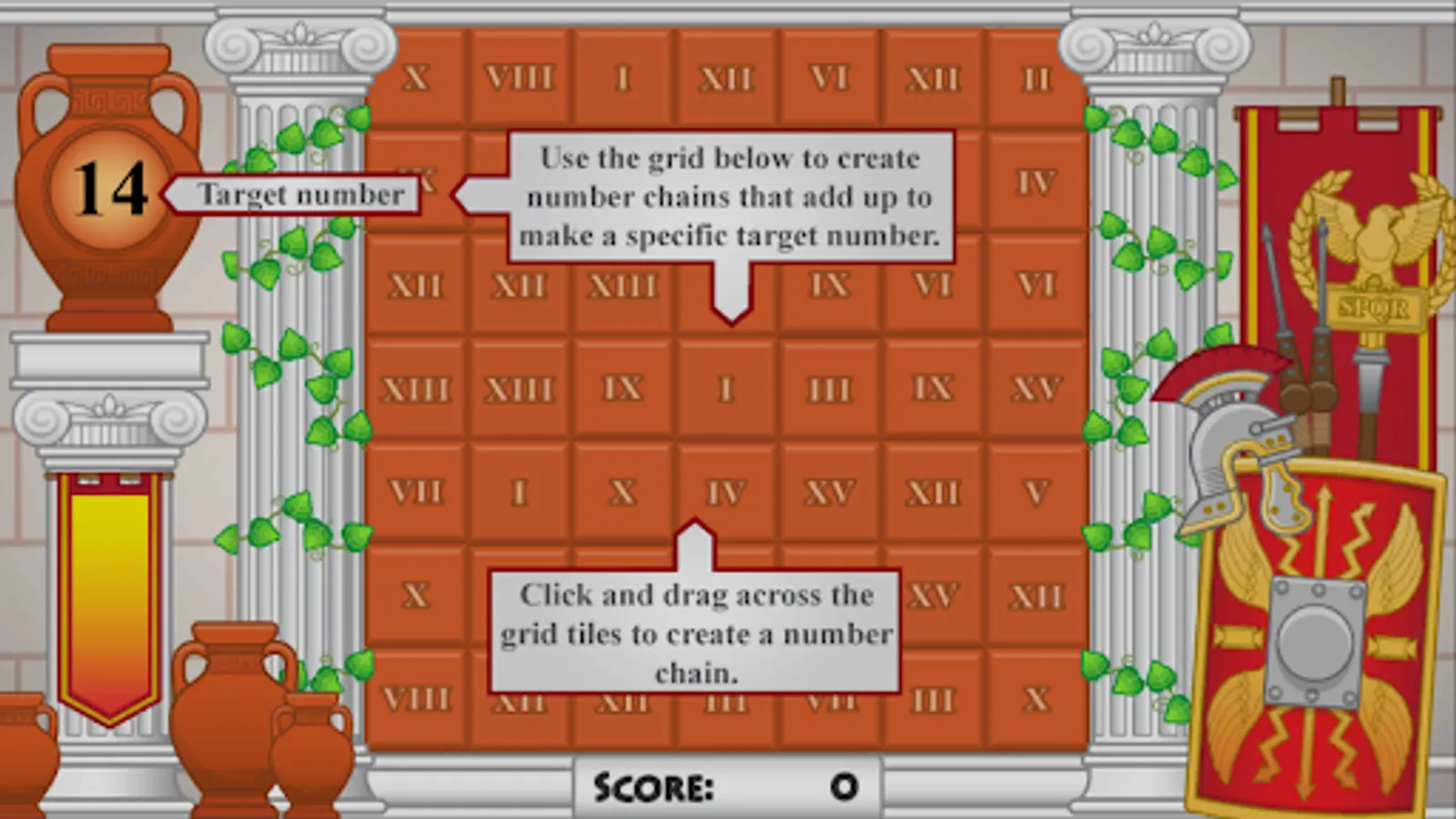 It’s time to test your number skills once again at the temple of numeracy in Addus Maximus. The temple elders will be testing your adding ability. They will give you a target number that you need to make using a set of Roman numeral terracotta tiles. Create number chains that correctly add up to the target score. Make as many chains as you can before you run out of time!