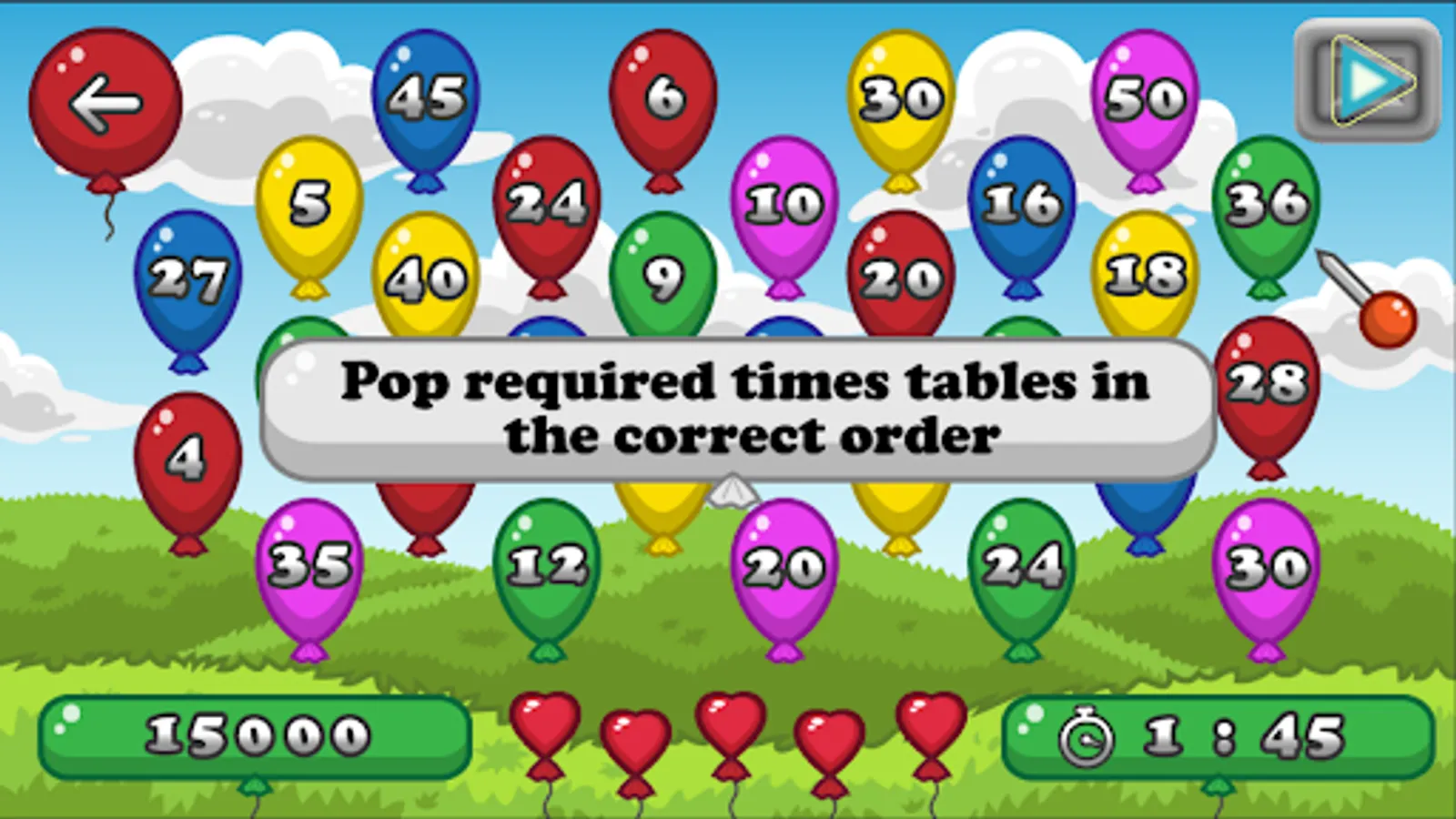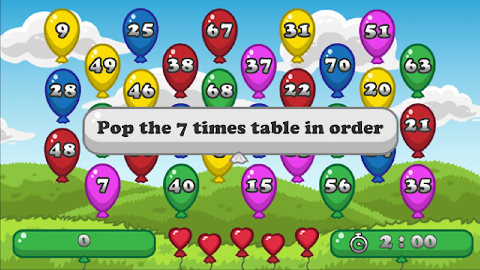 This light-hearted balloon game will test your time's tables knowledge. Groups of numbered balloons will appear and a target times table to complete. You simply need to pop the right balloons in the right order for as many target times tables as possible.
