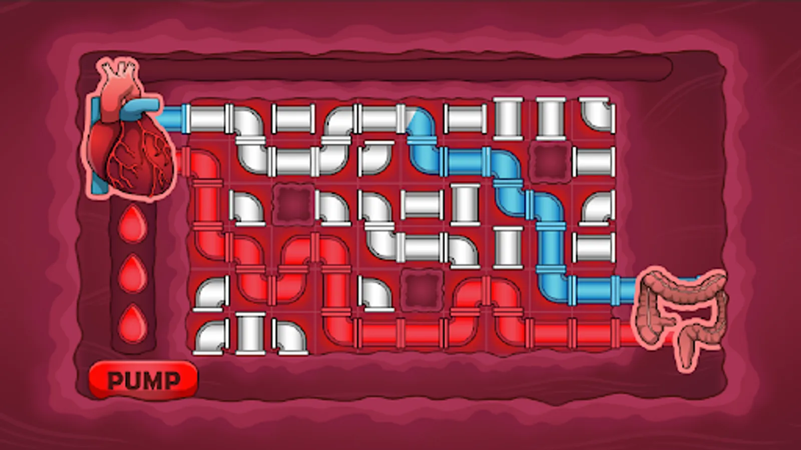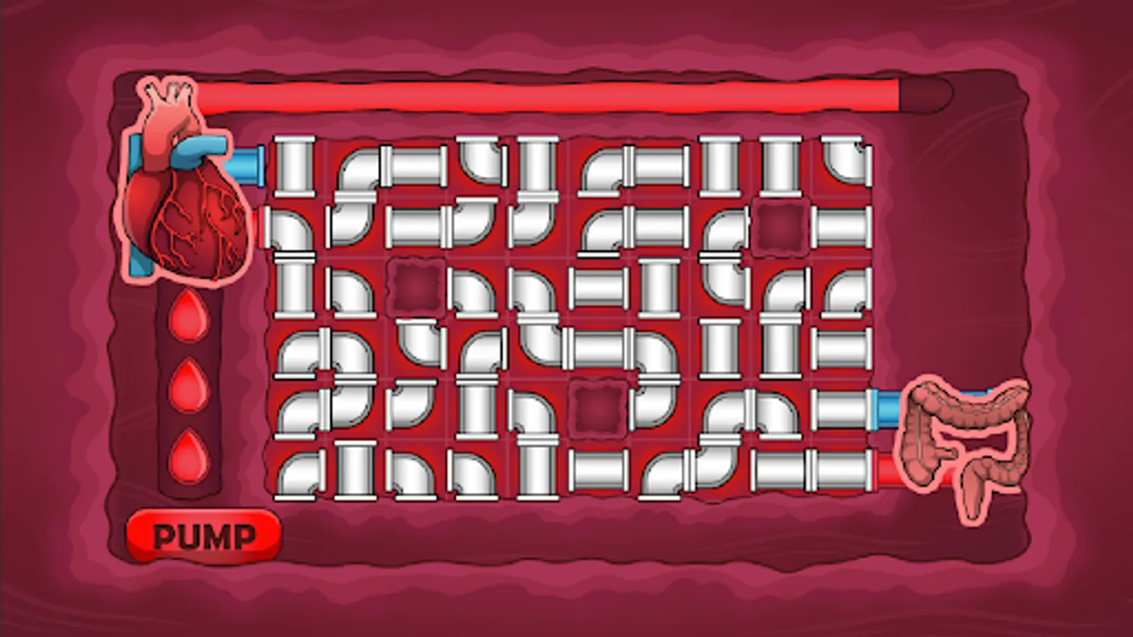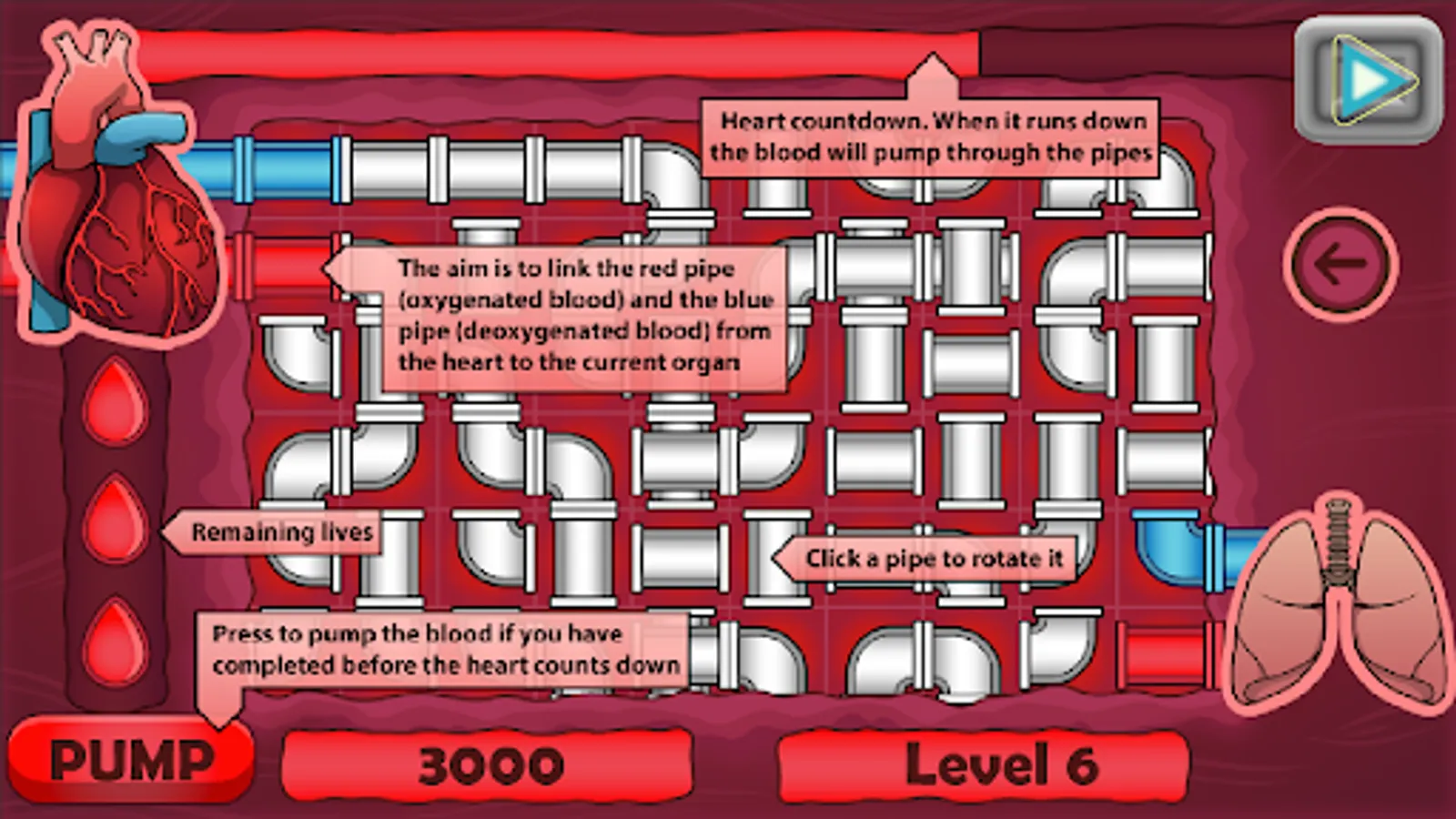 In this pipe puzzle game, you need to correctly connect the flow of blood from the heart to particular organs. Link oxygenated blood (red pipes) to an organ so it can continue to function properly. You also need to link the deoxygenated blood (blue pipes) from the organ back to the heart. Make a complete blood circuit to keep the body working.