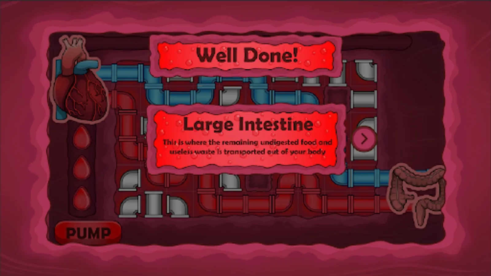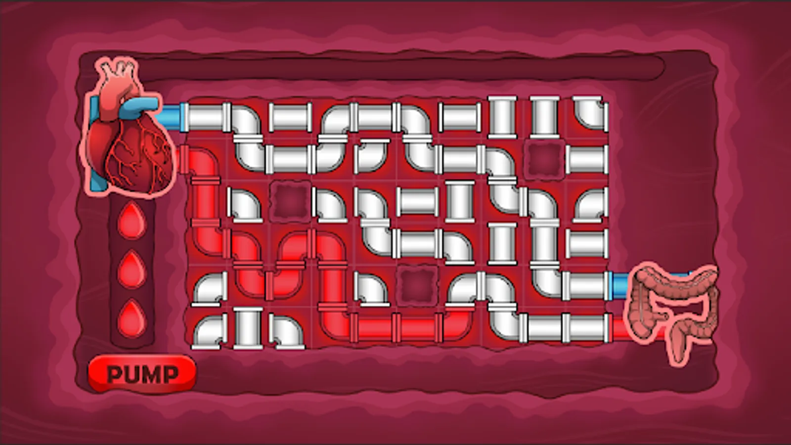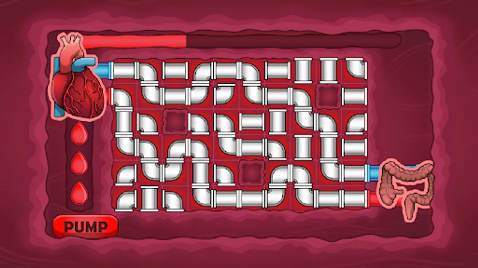 In this pipe puzzle game, you need to correctly connect the flow of blood from the heart to particular organs. Link oxygenated blood (red pipes) to an organ so it can continue to function properly. You also need to link the deoxygenated blood (blue pipes) from the organ back to the heart. Make a complete blood circuit to keep the body working.