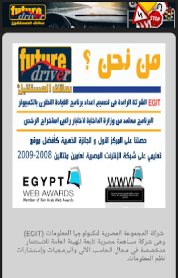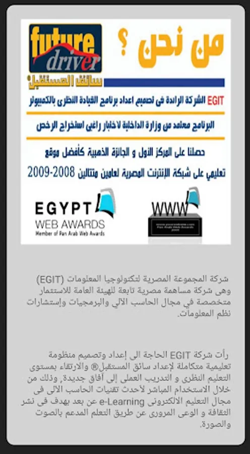 EGIT saw the need to develop and design an integrated educational system to prepare the driver of the future, and to upgrade the level of theoretical education and practical training to new horizons through the use of the latest technologies in the field of e-learning to spread the culture and awareness of traffic.