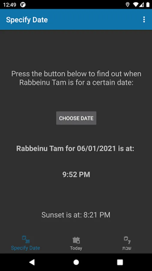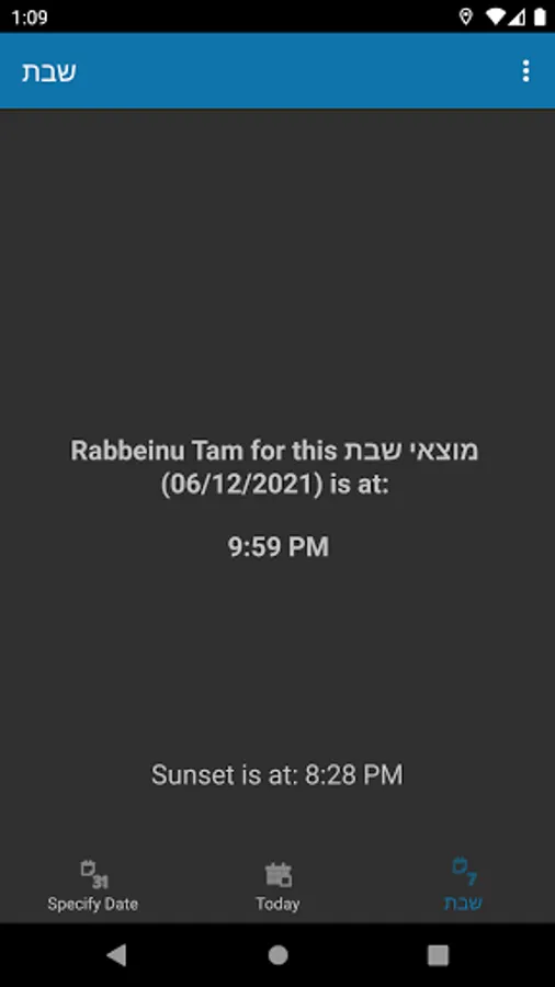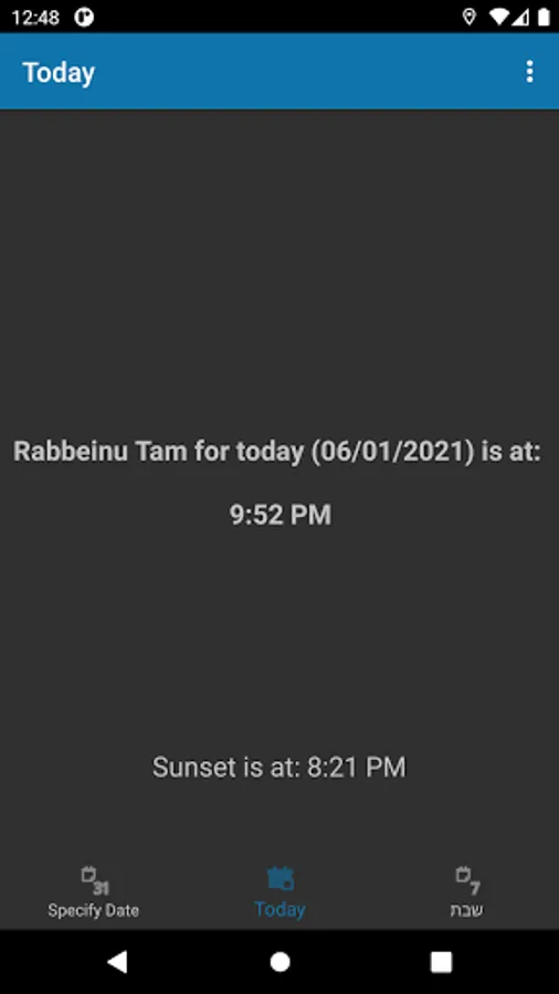 Welcome to the Rabbeinu Tam (ר"ת רבינו תם) app! This app is a passion project that I made while in college. While I was in Israel, I always kept Rabbeinu Tam every שבת (Shabbat/Shabbos) according to the Ohr HaChaim calendar that went according to Rabbi Ovadiah Yosef ZT"L. However, once I left Israel, I was no longer able to rely on the calendar.