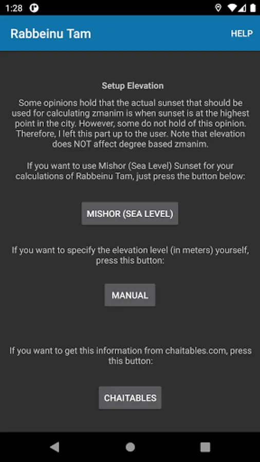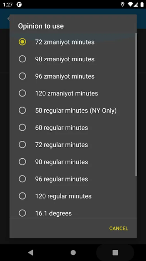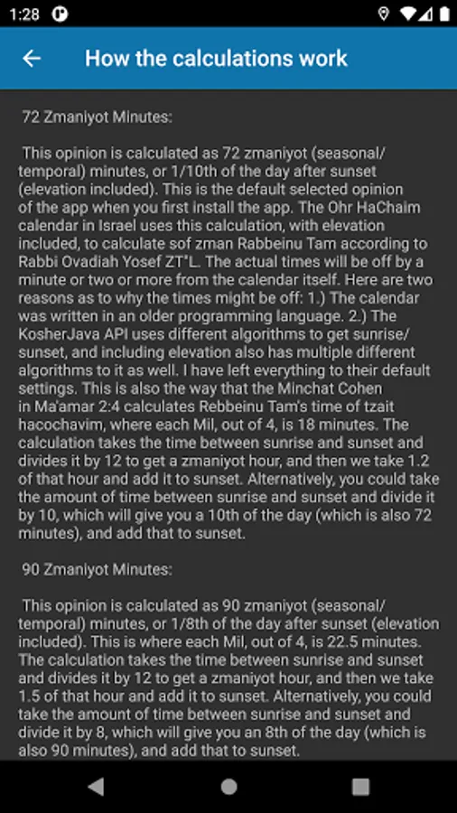 I have also added multiple opinions into this app as well. I have included all the possible zmanim of Rabbeinu Tam that were in the KosherJava API. Whether it be temporal (zmaniyot זמנית) minutes, regular minutes, or degrees. This app has it all! (If an opinion is missing, feel free to email me and I will add it to the app as soon as possible.)