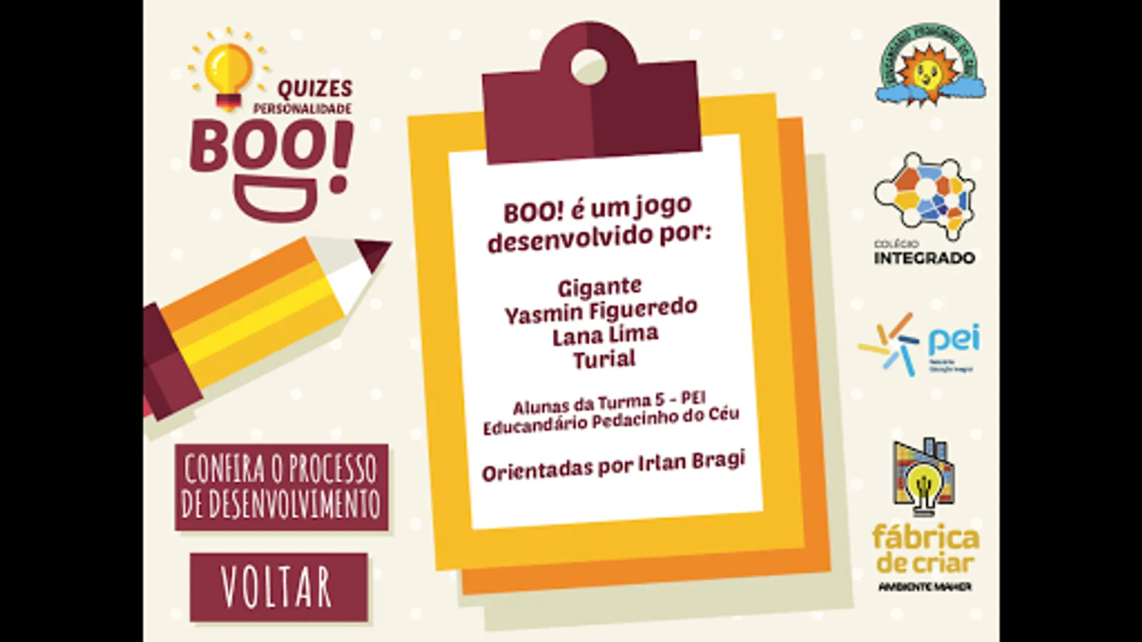 BOO! Personality Quizes is a game developed in the classroom by the students of Class 5 of PEI - Educandário Pedacinho do Céu, in Salvador-BA.