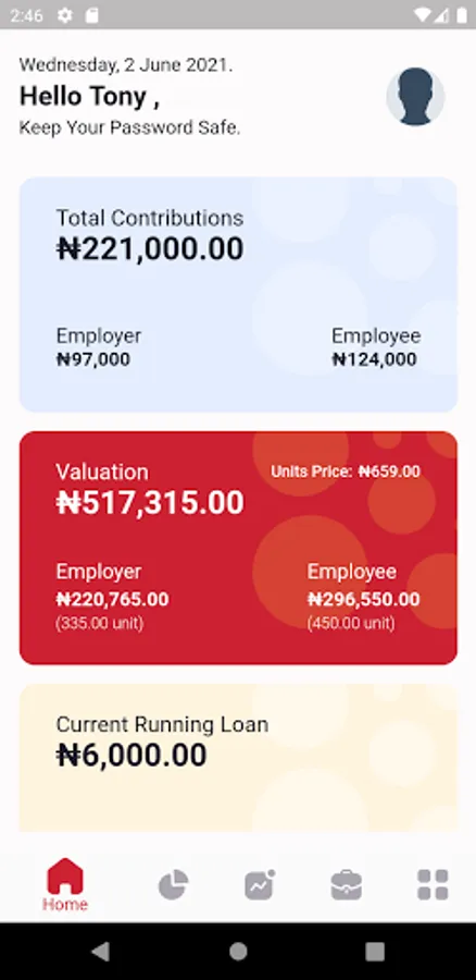 Home Page: This provides members with a summary of Contributions, Current Valuation, Running Loans, Portfolio Type and Current Interest Rate for New Loan applications.