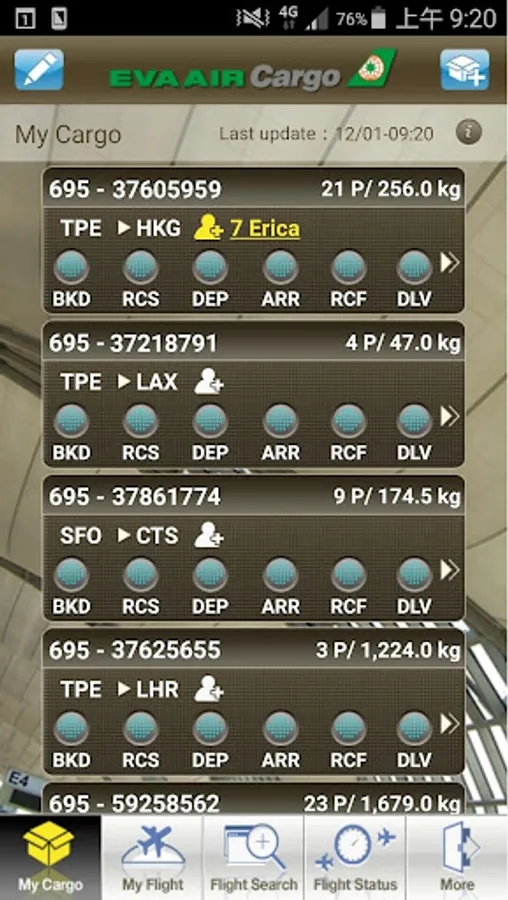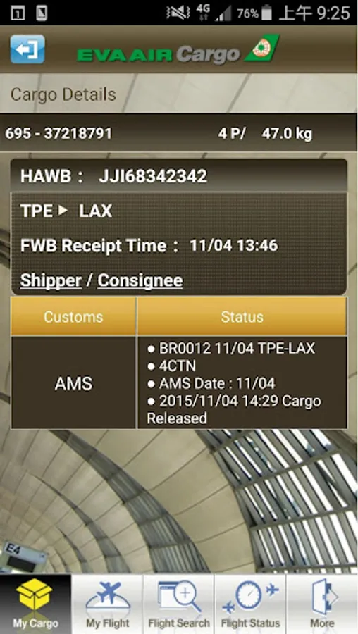 1.My Cargo - Review your shipment status instantly and automatically. After pre-setting Master Airway number, essential shipment status will be displayed through clear icon. You can check shipment status simply