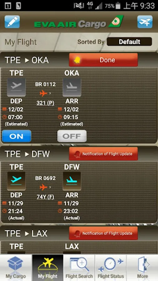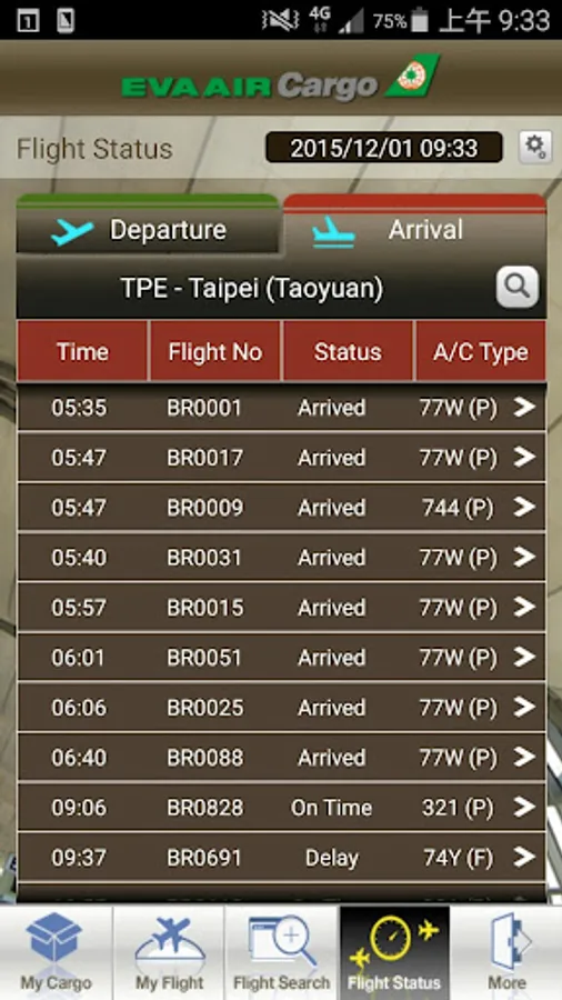 4. Flight Status – Browse the EVA Air flight status from and to each gateway instantly and check the actual departure and arrival time.