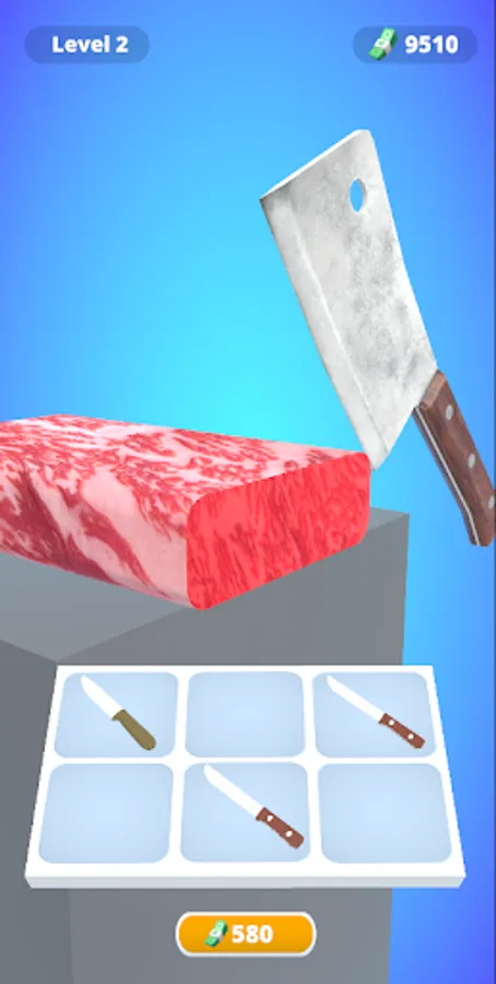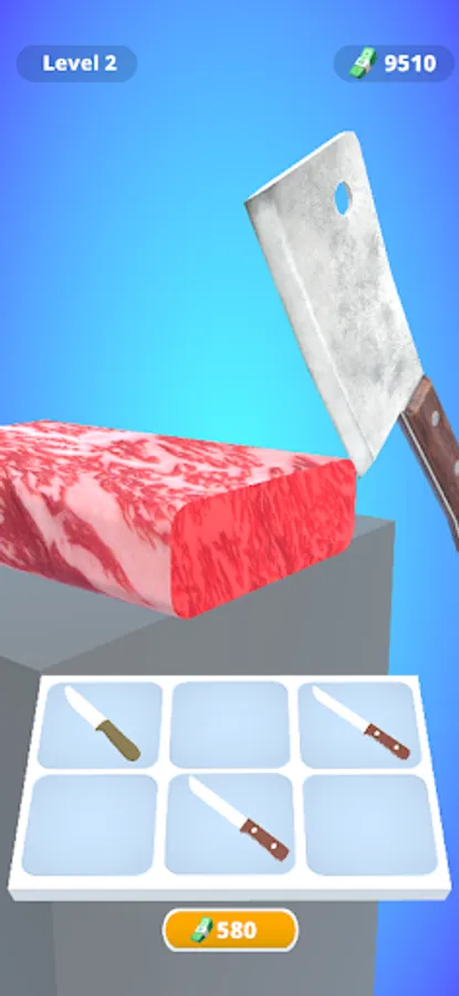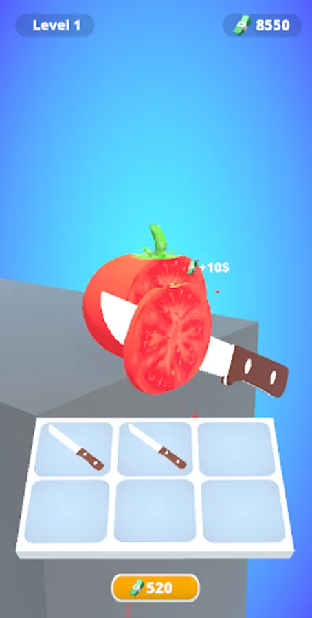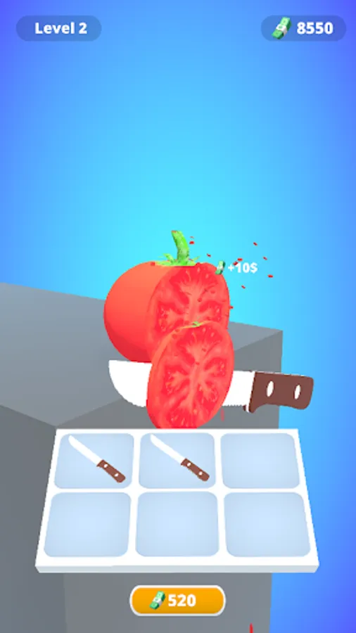 Add new knives and merge them by drag&drop. Reach new knife, axe, blades! Use them and cut foods faster!