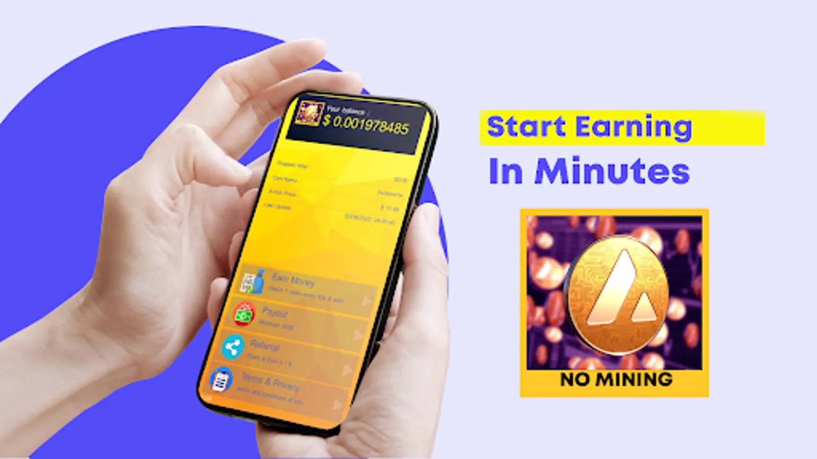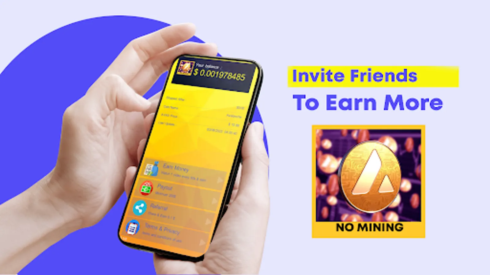 The "Earn Avalanche (AVAX) - No mining" application allows users to earn Avalanches by watching ads every day.
