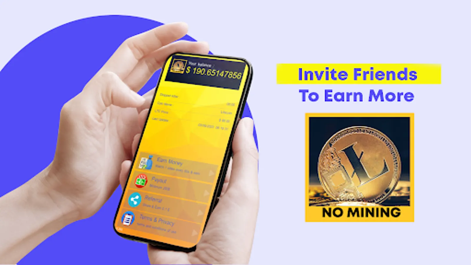 The "Earn Litecoin (LTC) - No mining" application allows users to earn Litecoins by watching ads every day.