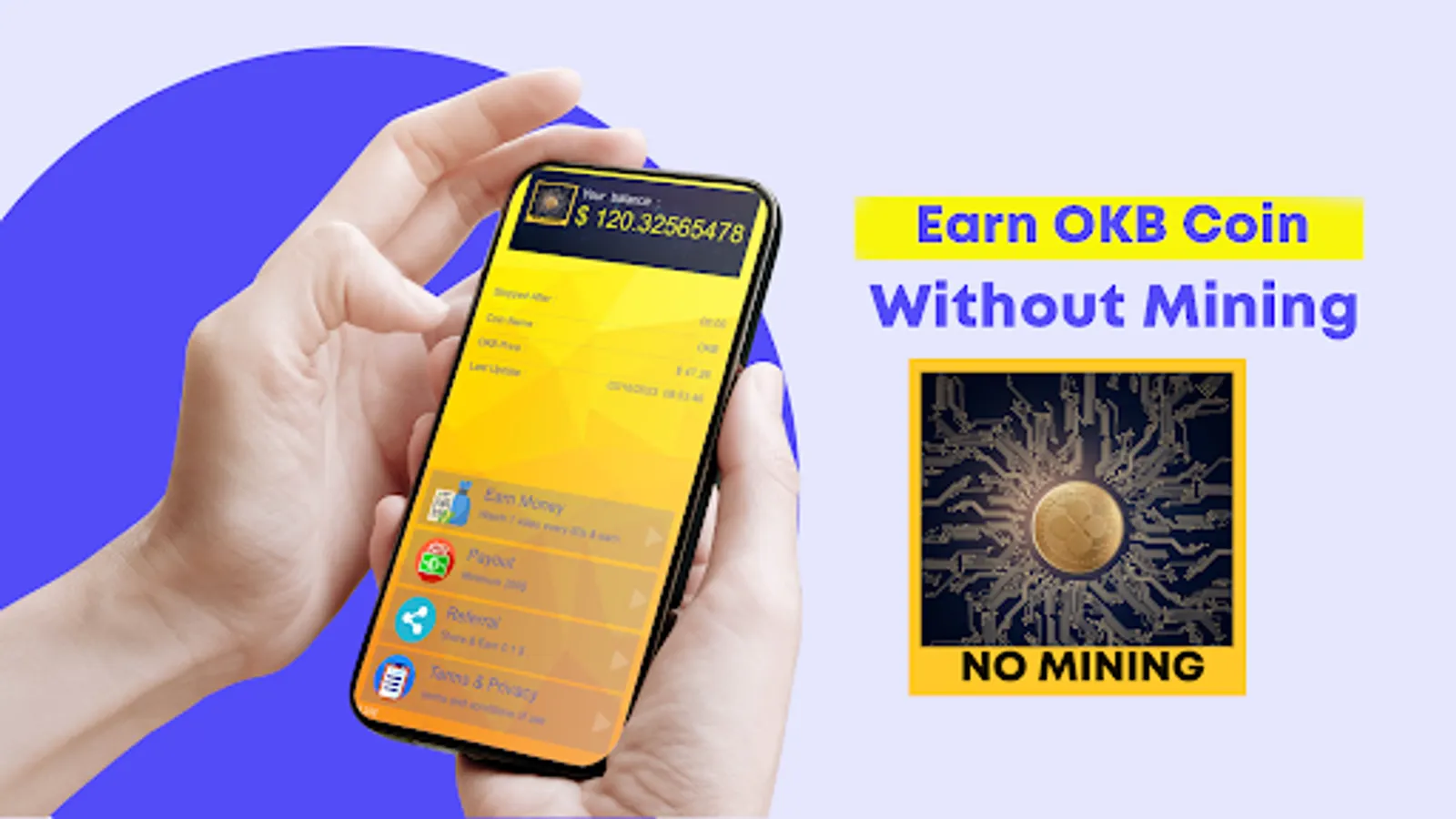 The "Earn OKB Coin (OKB) - No mining" application allows users to earn OKB Coins by watching ads every day.