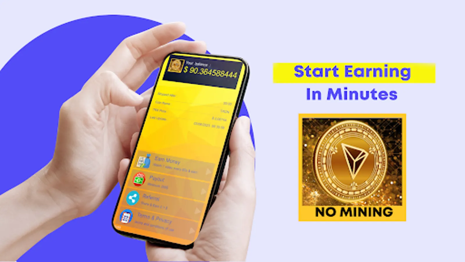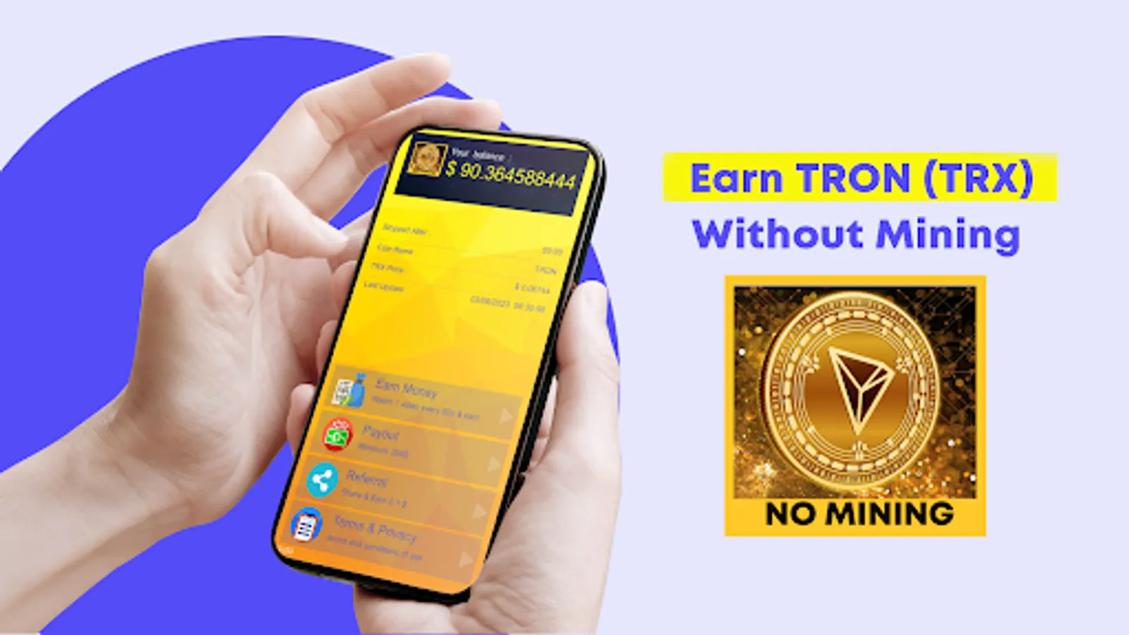 The "Earn Tron (TRX) - No mining" application allows users to earn Trons by watching ads every day.