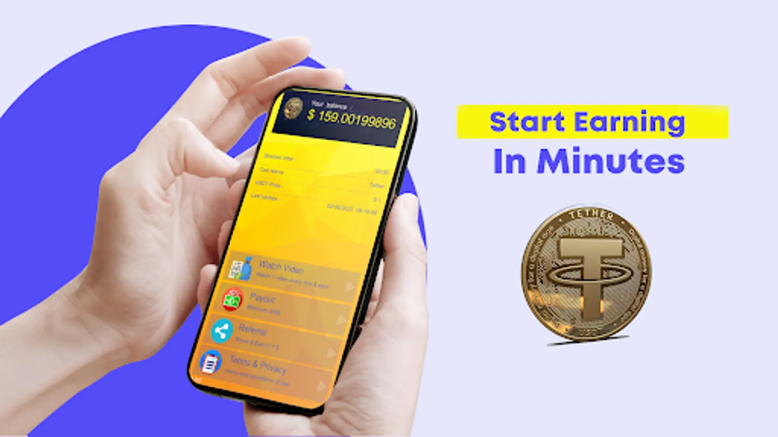 The "Earn Tether (USDT) - No mining" application allows users to earn Tethers by watching ads every day.