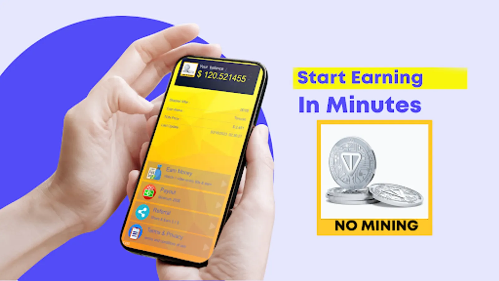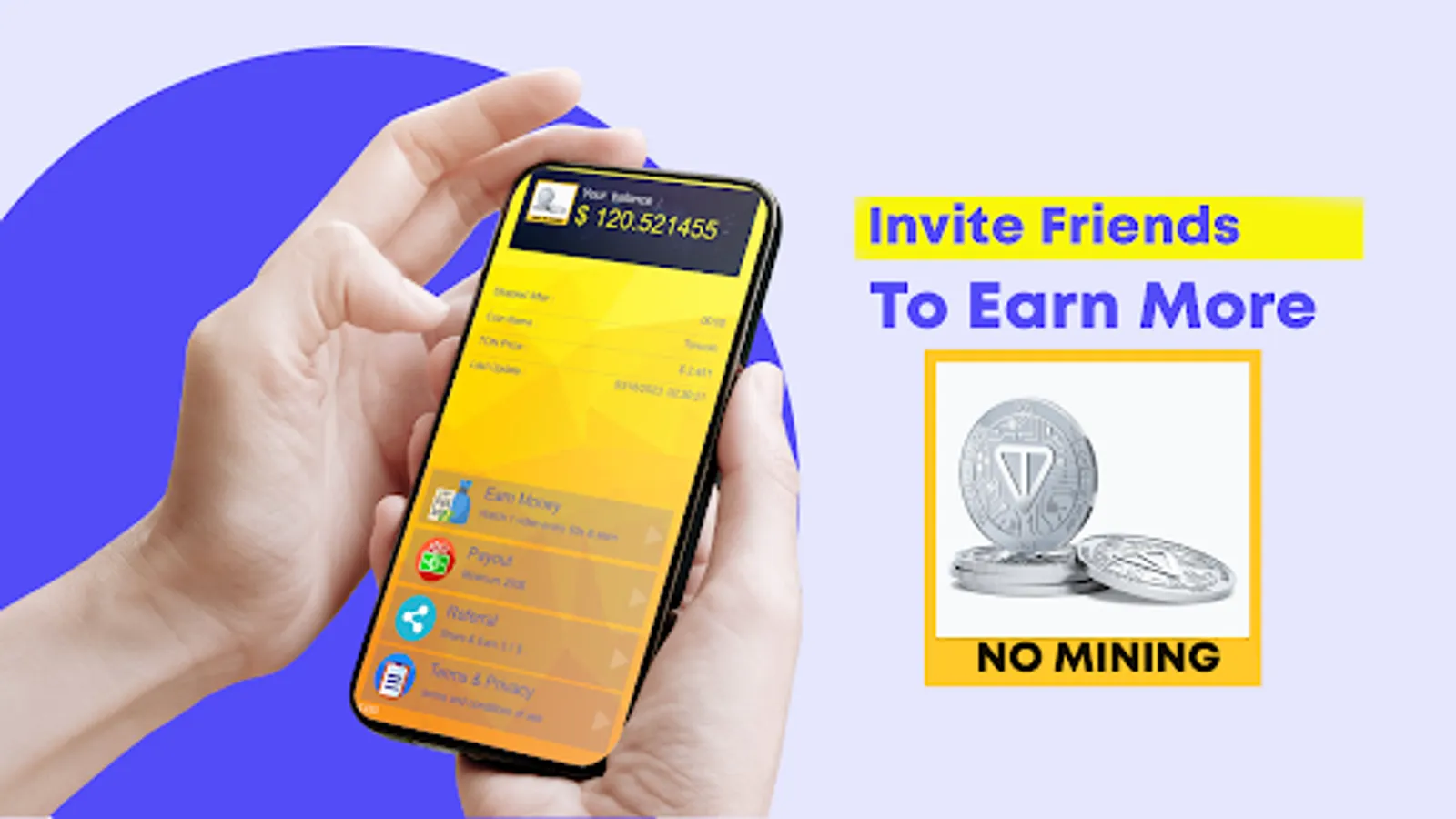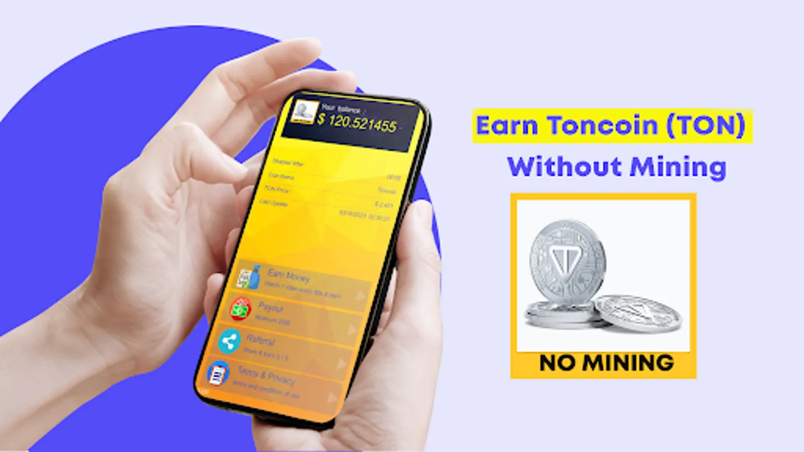 The "Earn Toncoin (TON) - No mining" application allows users to earn Toncoins by watching ads every day.