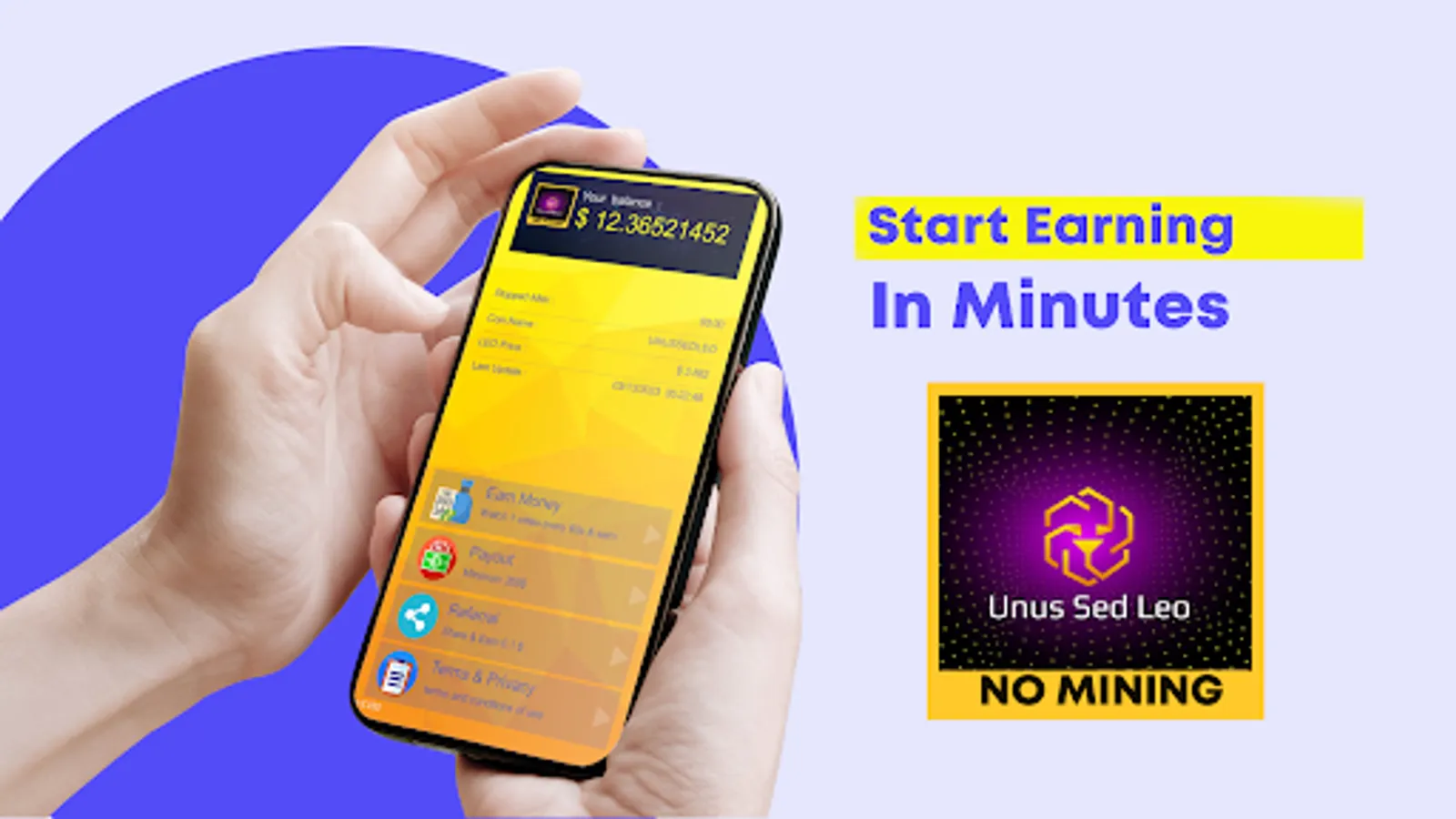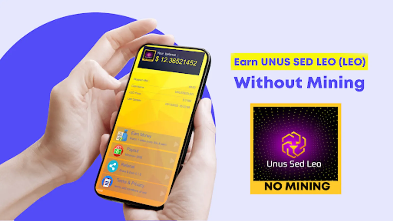 The "Earn UNUS SED LEO (LEO) - No mining" application allows users to earn UNUS SED LEOs by watching ads every day.